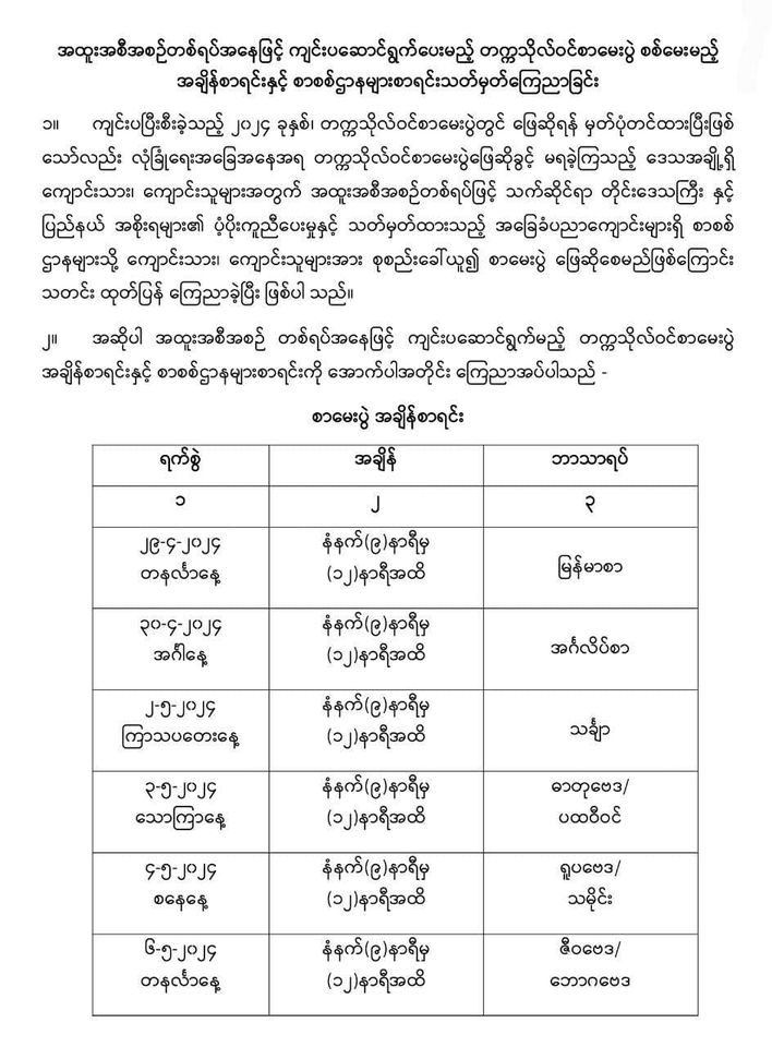 တက္ကသိုလ်ဝင်စာမေးပွဲကို အထူးအစီအစဉ်ဖြင့် ချင်းပြည်နယ်မှာမတူပီတွင် ဧပြီလ ၂၉ ရက်မှ မေလ ၆ ရက်အထိကျင်းပမည်