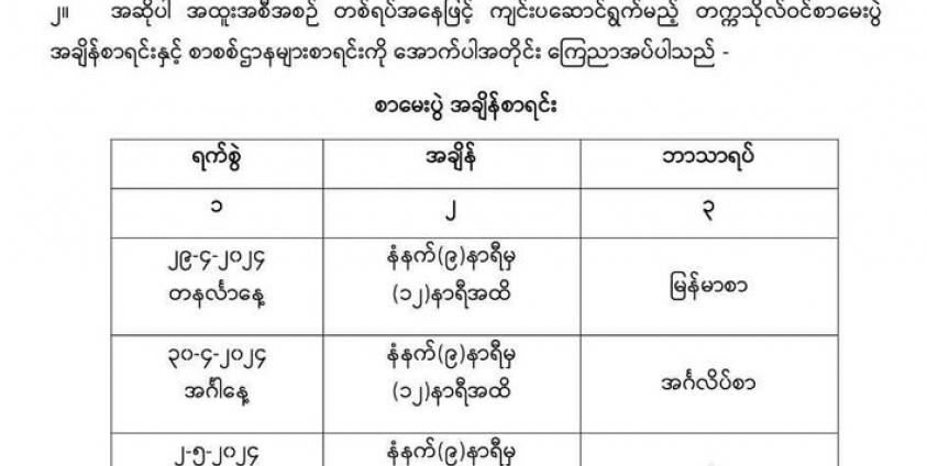 အထူးအစီအစဥ် တစ်ရပ်အနေဖြင့်သက်ဆိုင်ရာ တိုင်းဒေသကြီးနဲ့ပြည်နယ်ရှိသတ်မှတ်ထားသည့် စာစစ်ဌာနများတွင်စုစည်းခေါ်ယူပြီး ဖြေဆိုရန် ပြန်စီစဉ်ပေးမည်လို့ မြန်မာနိုင်ငံစာစစ်ဦးစီးဌာနကမတ်လ ၁၉ ရက်မှာ ကြေညာထားကာ