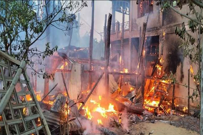 ရခိုင်ပြည်၊ ဘူးသီးတောင်မြို့တွင် စစ်ကောင်စီတပ်နှင့် စစ်သင်တန်းဆင်းမွတ်ဆလင်များ ပူးပေါင်းဖျက်ဆီးမှုကြောင့် မီးလောင်ပျက်စီးသွားသည့် နေအိမ် ထောင်ချီရှိနေပြီဖြစ်ကြောင်း ဒေသခံများထံမှ သိရသည်။