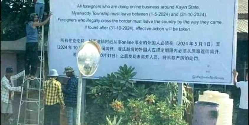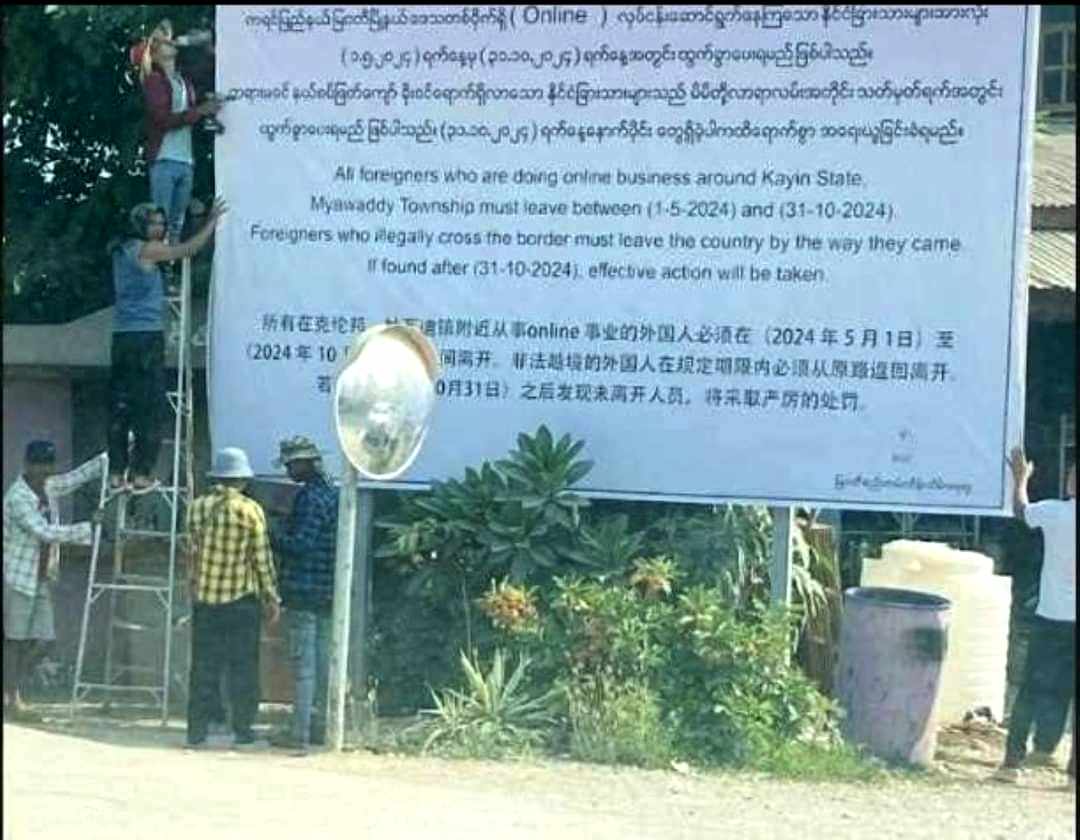 လတ်တလောတွင် မြဝတီမြို့ သောင်ရင်းမြစ်ကမ်းတစ်လျှောက်နှင့် ရွှေက္ကိုလ်မြို့သစ်လမ်းဆုံ၊ လမ်းမနေရာ များတွင် တရုတ်နိုင်ငံသားများ ထွက်ခွာကြရန် သတိပေး ဆိုင်းဘုတ်များကို BGF တပ်ဖွဲ့က လိုက်လံစိုက်ထူ ထောင်ပြထားသော်လည်း တရုတ်ငွေလိမ်လုပ်ငန်းများမှာ ဆက်လက်လည်ပတ်နေဆဲဖြစ်ကြောင်း ထို ငွေလိမ်လုပ်ငန်းများ လုပ်ကိုင်နေသည့် အလုပ်သမားအချို့ထံမှ သိရသည်။