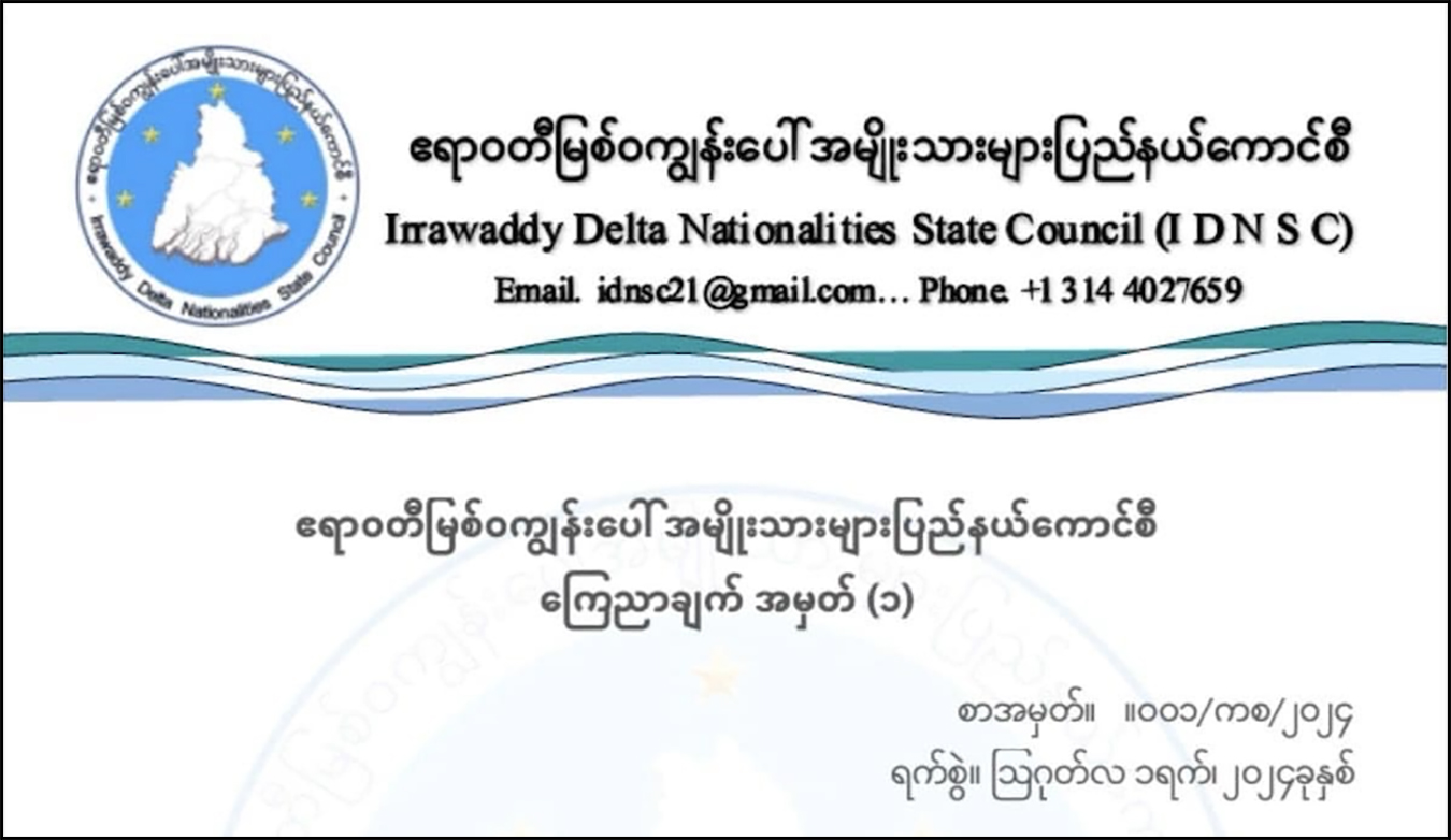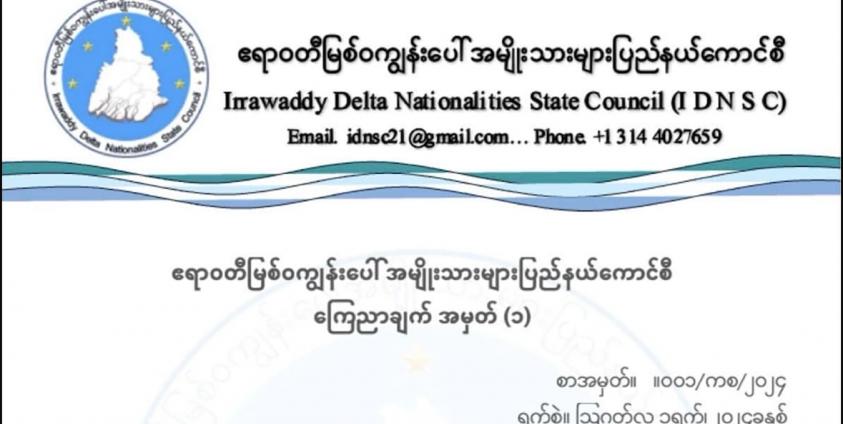 အဝေးရောက် ဧရာဝတီနိုင်ငံရေးလှုပ်ရှားဆောင်ရွက်သူများက ဧရာဝတီမြစ်ဝကျွန်းပေါ် အမျိုးသားများပြည်နယ်ကောင်စီ(IDNSC)ကို ဖွဲ့စည်းလိုက်ကြောင်း ယခုလ ဩဂုတ်လ ၁ ရက်နေ့တွင် ကြေညာချက်တစ်စောင် ထုတ်ပြန်ခဲ့သည်။