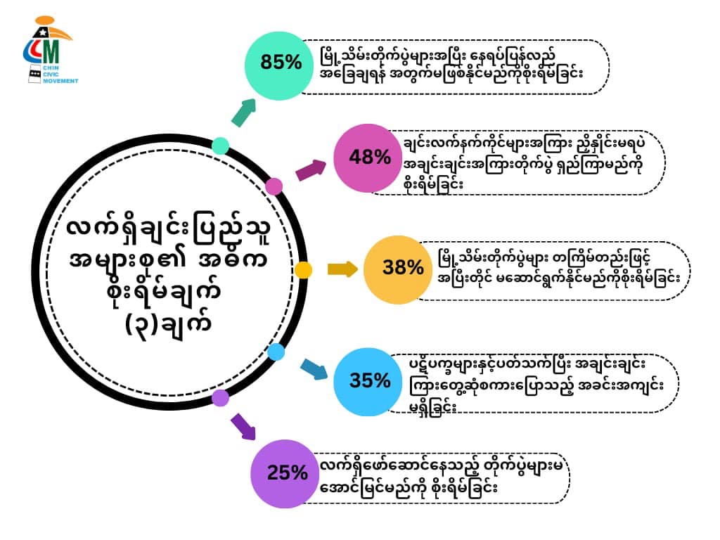 ချင်းပြည်တွင် ချင်းတော်လှန်ရေးအဖွဲ့အချင်းချင်းကြား ဖြစ်ပွားနေသည့်ပဋိပက္ခများ ဖြေရှင်းနိုင်ရေးကို ချက်ချင်းဆောင်ရွက် သင့်သည်ဟု ချင်းလူထုစစ်တမ်းတွင် ဖြေဆိုသူ ၈၈ ရာခိုင်နှုန်းက ပြောကြောင်း Chin Civic Movement – CCM က ထုတ်ပြန်သည်။