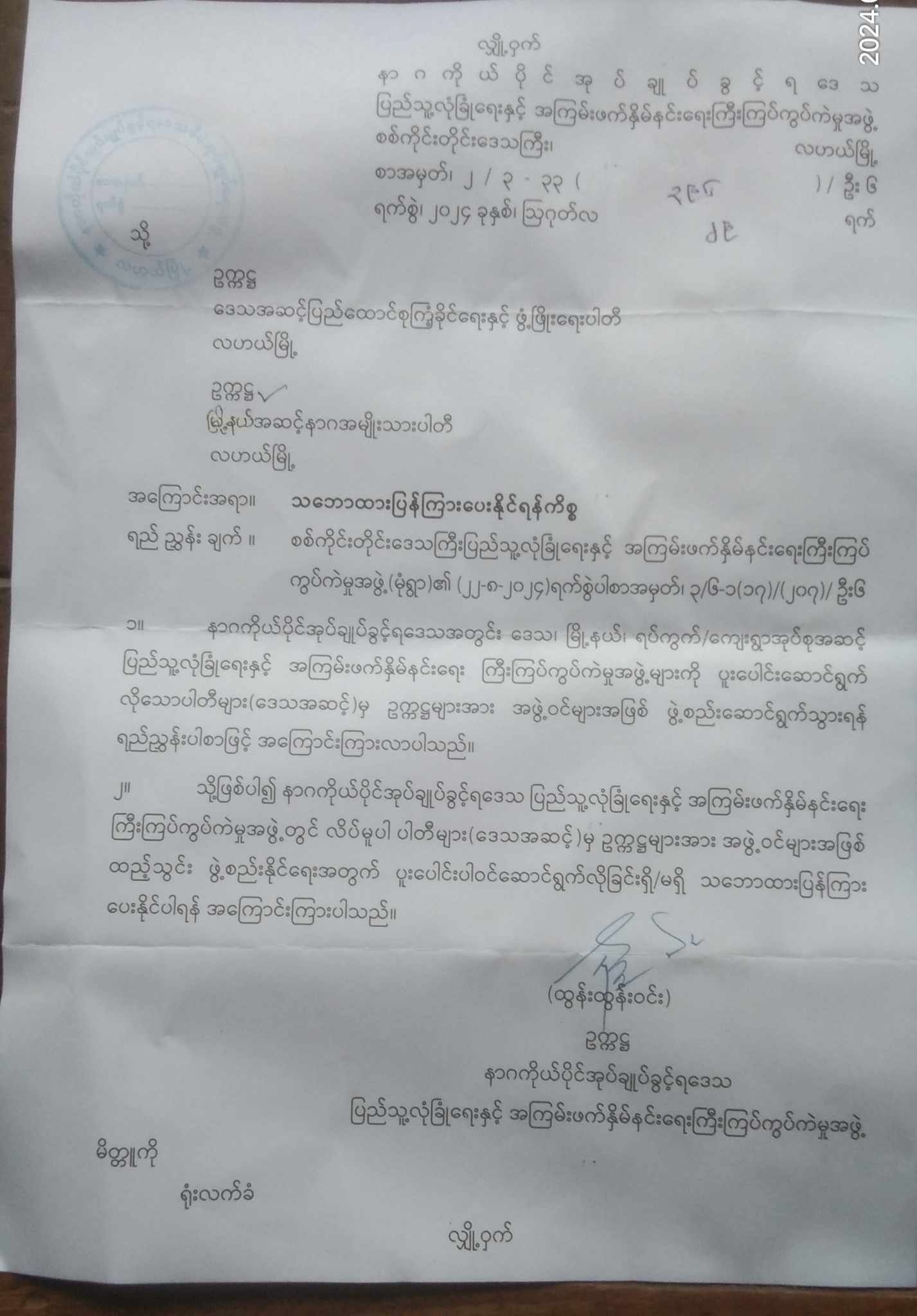 နာဂ ကိုယ်ပိုင်အုပ်ချုပ်ခွင့်ရ ဒေသရှိ ဒေသအဆင့် ပြည်ထောင်စု ကြံ့ခိုင်ရေးနှင့် ဖွံ့ဖြိုးရေးပါတီနှင့် မြို့နယ်အဆင့် နာဂ အမျိုးသားပါတီ (NNP) တို့အား စစ်ကောင်စီ၏ ပြည်သူ့လုံခြုံရေးနှင့် အကြမ်းဖက် နှိမ်နင်းရေး ကြီးကြပ်ကွပ်ကဲမှုအဖွဲ့ တွင် အဖွဲ့ဝင်အဖြစ် ပူးပေါင်းပါဝင် ဆောင်ရွက်လိုခြင်း ရှိ မရှိ ဩဂုတ်လ ၂၉ ရက်နေ့က လျှိုဝှက်အကြောင်းကြား မေးမြန်းခဲ့သည်။