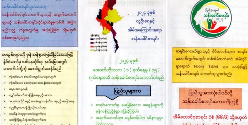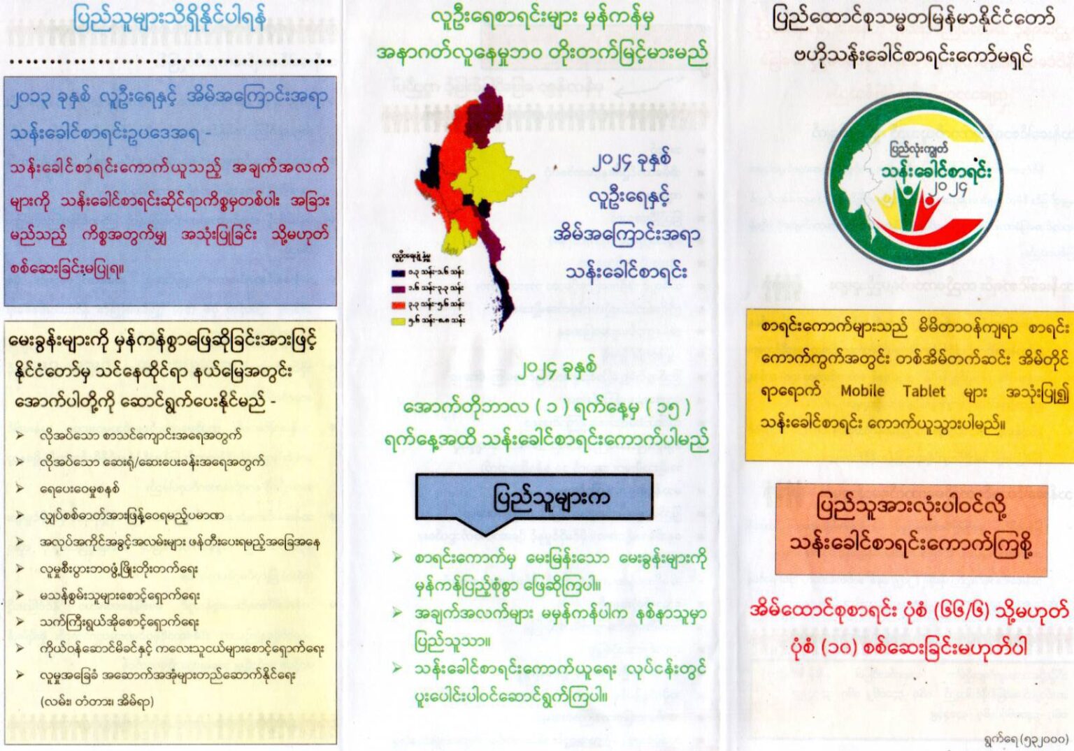 ၂၀၁၄ ခုနှစ်တွင် တရားဝင် ကောက်ခံထားသည့် မြန်မာနိုင်ငံ၏ လူဦးရေးမှာ (၅၁) သန်းကျော်ရှိကြောင်း သိရပြီး လက်ရှိ တိုက်ပွဲဖြစ်ပွားနေသည့် ကာလအတွင်း သန်းခေါင်စာရင်းကို ကောက်ခံသွားရန် ပညာပေး လုပ်ဆောင်မှု များစတင်လုပ်ဆောင်လာပြီးဖြစ်ကြောင်း သိရသည်။