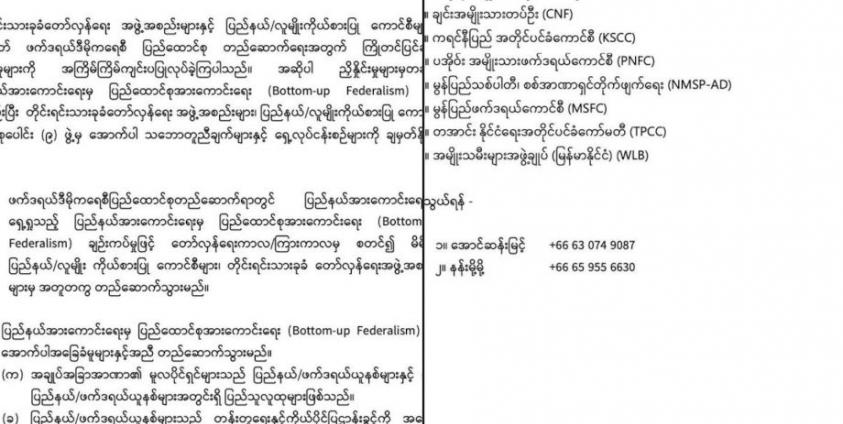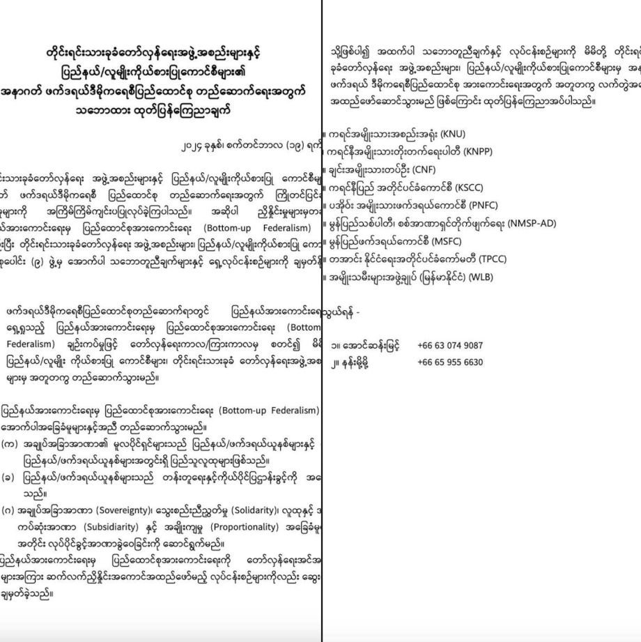 အနာဂါတ်ဖက်ဒရယ် ဒီမိုကရေစီပြည်ထောင်စု အားကောင်းရေးအတွက် အတူတကွလက်တွဲ အကောင်အထည်ဖော်ဆောင်ရွက် သွားမည်ဖြစ်ကြောင်း တိုင်းရင်သားတော်လှန်ရေးအဖွဲ့ - EROs နှင့် ပြည်နယ်/ လူမျိုးကိုယ်စားပြု ကောင်စီများ (၉) ဖွဲ့က စက်တင် ဘာလ ၁၉ ရက်တွင် ပူးတွဲ၍ သဘောထားထုတ်ပြန် ကြေညာလိုက်သည်။