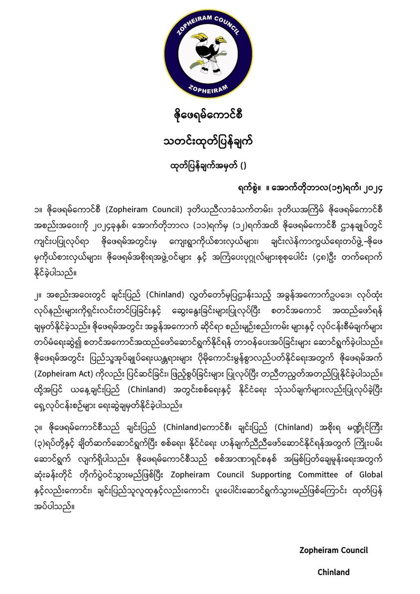 စစ်အာဏာရှင်စနစ် အမြစ်ပြတ်ချေမှုန်းရေးအတွက် ဆုံးခန်းတိုင် တိုက်ပွဲဝင်သွားမည်ဖြစ်ပြီး ချင်းပြည်လူထုအပါအဝင် Zopheiram Council Supporting Committee of Global တို့နှင့် ပူးပေါင်းဆောင်ရွက်သွားမည်ဟု သိရသည်။