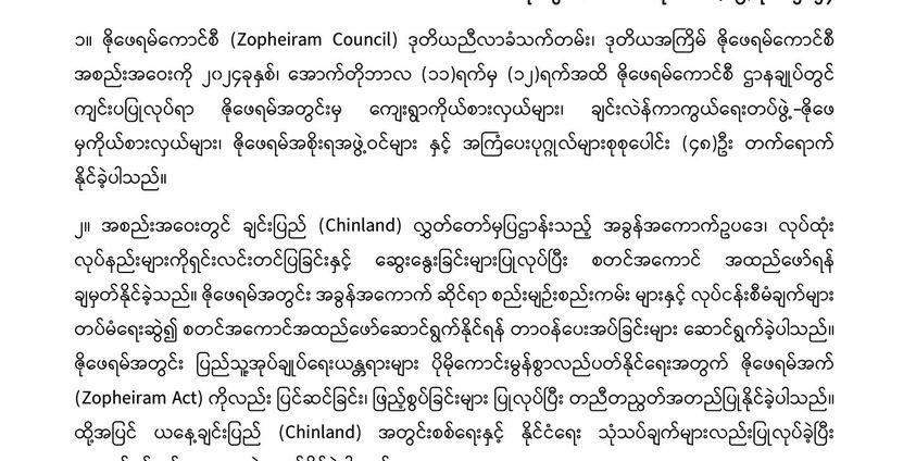 ဇိုဖေရမ်အက်ဥပဒေကိုလည်း ဇိုဖေရမ်ဒေသတွင် ပြည်သူ့အုပ်ချုပ်ရေး ယန္တရားများ ပိုမိုကောင်းမွန်စွာ လည်ပတ်နိုင်ရေးအတွက် ပြင်ဆင်ခြင်း၊ ဖြည့်စွက်ခြင်းများ ပြုလုပ်ရန် ယင်းအစည်းအဝေးတွင် အတည်ပြုနိုင်ထားပြီ ဖြစ်ကြောင်း ဇိုဖေရမ်ကောင်စီထံမှ သိရသည်။