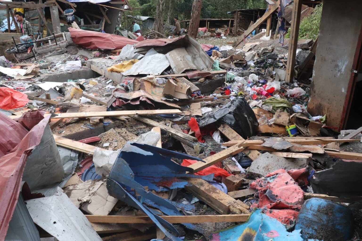 လေကြောင်းတိုက်ခိုက်ခံရမှုကြောင့် ပျက်စီးသွားတဲ့ ဘန်ကောက်စစ်ရှောင်စခန်းမြင်ကွင်း။ (ဓါတ်ပုံ - Khun Yaw Han )