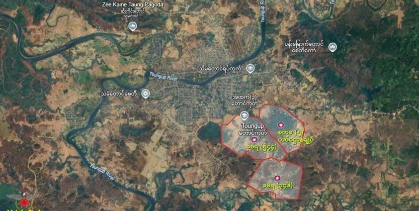တောင်ကုတ်တက္ကသိုလ်ရှိ အခိုင်အမာတပ်စွဲထားသောစခန်း၊ တက္ကသိုလ်မောင်းတံဂိတ်၊ စကခ (၅) ဌာနချုပ်ဂိတ်စခန်းနှင့် ရာဘာခြံစခန်းများ အပါအဝင် တပ်စခန်း ၁၀ ခုအထိ သိမ်းပိုက်ထားသည်။