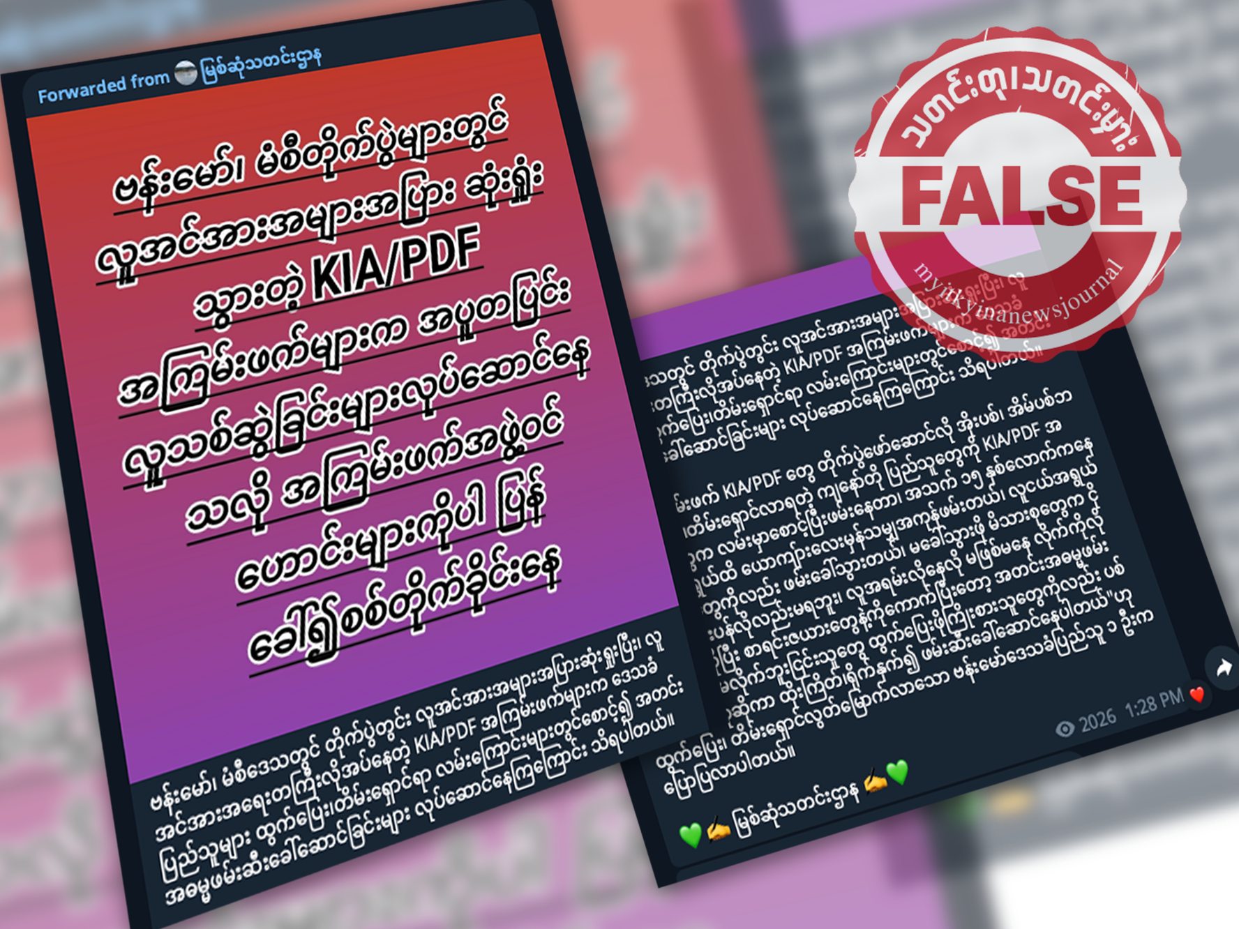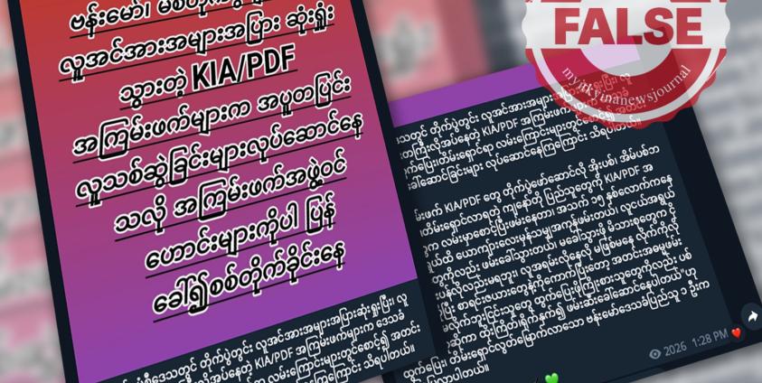 ကချင်ပြည်နယ်၊ ဗန်းမော် မံစီ တိုက်ပွဲတွေမှာ KIA/PDF ပူးပေါင်းတပ်တွေက လူအင်အားလိုနေတာကြောင့် စစ်ရှောင်ပြည်သူတွေကို အတင်းအဓမ္မ ဖမ်းဆီးခေါ်ဆောင်ပြီးတော့ စစ်တိုက်ခိုင်းနေတယ်ဆိုတဲ့ ဝါဒဖြန့်သတင်းအမှားကို ဒီဇင်ဘာလ ၈ ရက်နေ့ကစတင်ပြီးတော့ စစ်ကောင်စီ လော်ဘီချန်နယ်လ်တစ်ခုဖြစ်တဲ့ “မြစ်ဆုံသတင်းဌာန” တယ်လီဂရမ်ချန်နယ်လ်ကနေ ရေးသားဖြန့်ဝေနေပါတယ်။