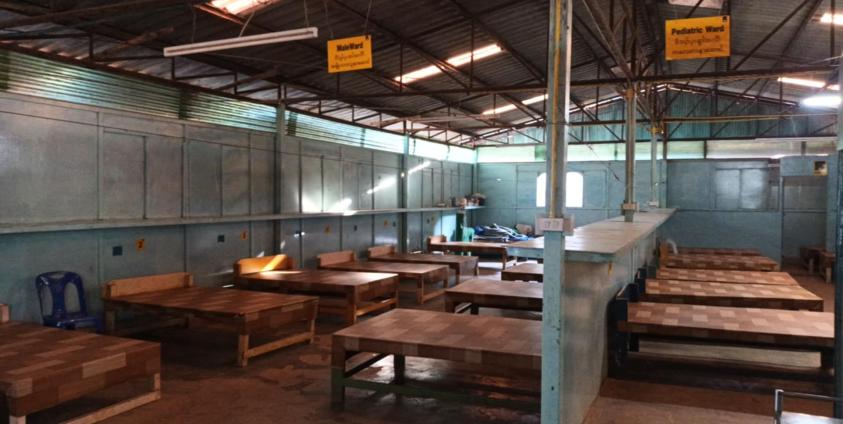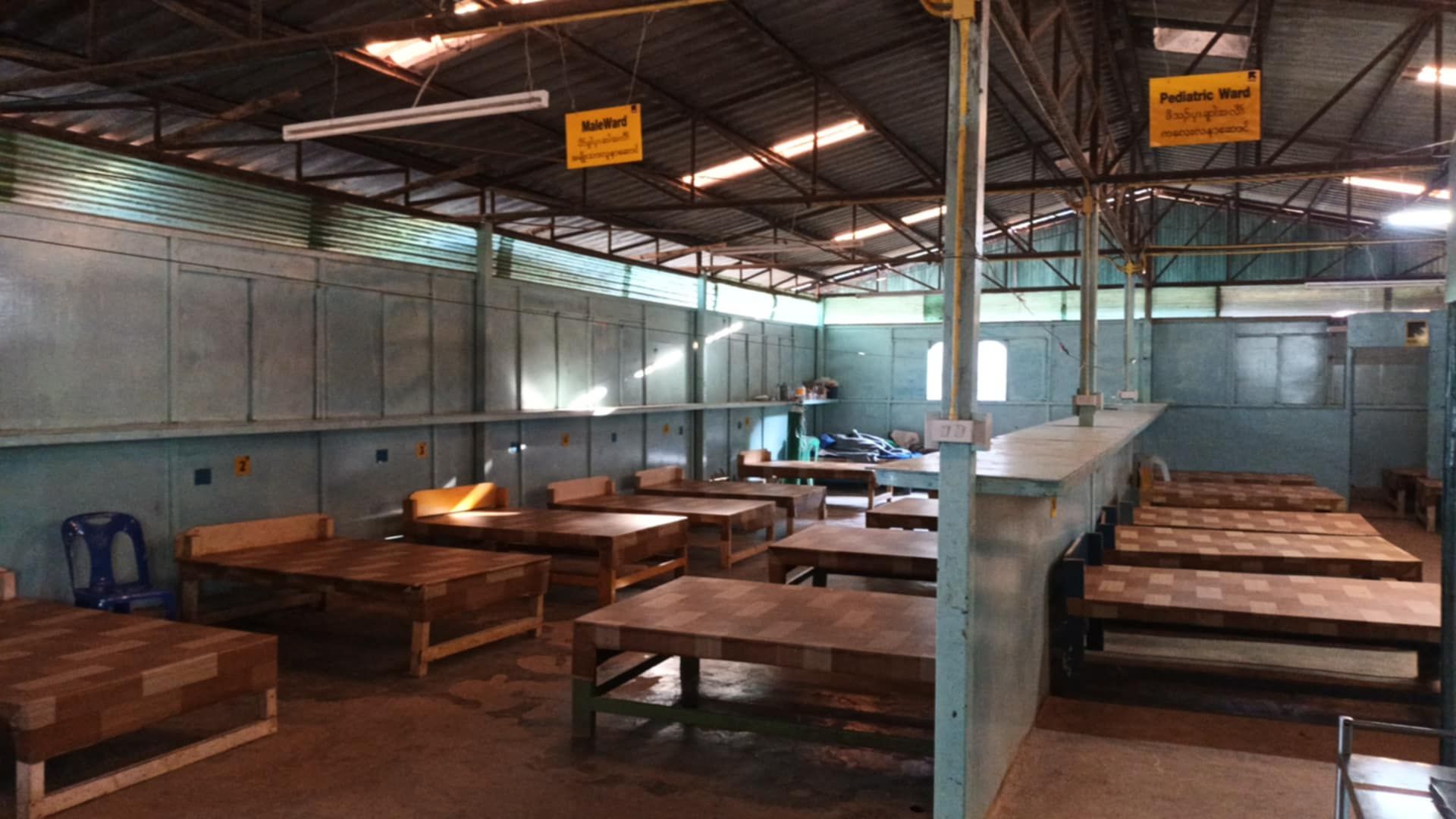 သွပ်ပြားအမိုးနိမ့်နိမ့် ဘိလပ်မြေအုပ်နံရံနှင့် အကြမ်းထည်သာသာ ယာယီဆောက်လုပ်ထားသည့် အဆောက်အဦး၌ ငါးထပ်သားကာ အခန်းများဖွဲ့ထားပြီး အခန်းတစ်ခုချင်းစီတွင် ကော်ဇောကပ်ထားသည့် လူနာကုတင်အများအပြား တန်းစီထားသည်။