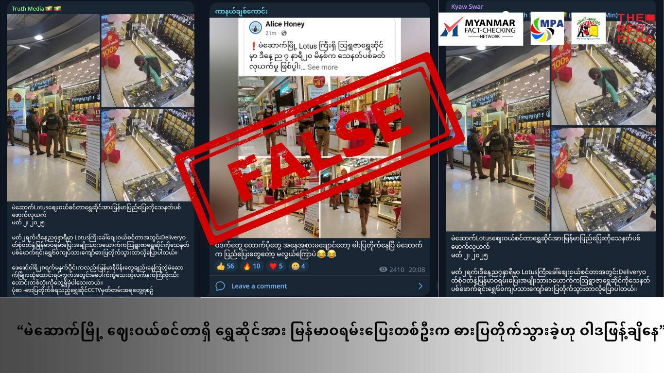 ထိုင်း-မြန်မာနယ်စပ် မဲဆောက်မြို့ Lotus ဈေးဝယ်စင်တာရှိ သြရွဇာ ရွှေဆိုင်အား တော်လှန်ရေးထောက်ခံသူ ဝရမ်းအထုတ်ခံထားရသည့် မြန်မာအမျိုးသားတစ်ဦးက ဓားပြတိုက်သွားကြောင်း ဝါဒဖြန့်ချိနေပါသည်။