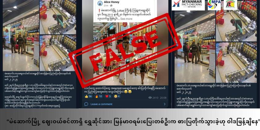 စစ်ကောင်စီအားပေး တယ်လီဂရမ် ဝါဒဖြန့်ချန်နယ်တစ်ဖြစ်သည့် Truth Media ချန်နယ်က မတ်လ ၂ ရက်တွင် ဖြန့်ချိခဲ့ပြီး “မတ်လ ၂ ရက်၊ ည ၇ နာရီမှာ Lotus ကြီးခေါ် ဈေးဝယ်စင်တာအတွင်း Delivery ဝတ်စုံဝတ်နဲ့ မြန်မာဝရမ်းပြေးအမျိုးသား ၁ ယောက်က သြရွဇာရွှေဆိုင်ကို သေနတ်ပစ်ဖောက်ရင်း ရွှေ ၆၀ ကျပ်သားကျော် ဓားပြတိုက်သွားတာလို့ ပြောပါတယ်” ဟု (မူရင်းအတိုင်း) ဆိုကာ ရေးသားဖြန့်ချိခဲ့ပါသည်။