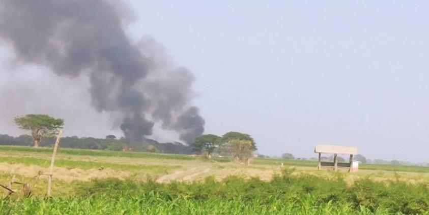 မတ်လ ၅ရက်နေ့ နေ့လယ်ပိုင်းတွင် ရေစကြိုနယ် ရေလယ်ကျွန်းဒေသရှိ ဇရပ်နီကျေးရွာကို စစ်ကောင်စီတပ်ဖွဲ့က မီးရှို့နေသည်ကို အဝေးမှ တွေ့ မြင်ရစဉ်။ (ဓါတ်ပုံ – Yesagyo Township Info Committee)