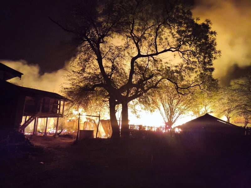မတ်လ ၂၃ ရက်နေ့ မနက် ၁ နာရီ ဝန်းကျင်အချိန်တွင် စစ်ကောင်စီ၏ လေကြောင်းတိုက်ခိုက်မှုကြောင့် မီးလောင်ပျက်စီးနေသည့် လက်ဝဲမြင်းနီကျေးရွာအတွင်းရှိ နေအိမ်များကို တွေ့ရစဉ်။ (ဓါတ်ပုံ – နွားထိုးကြီး - Journal)