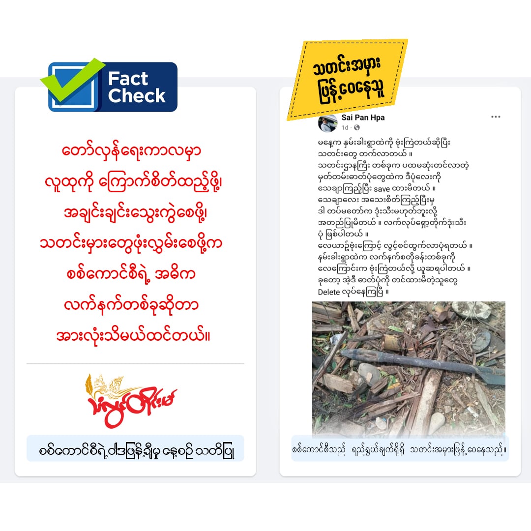 “မကွေးတိုင်း ဂန့်ဂေါမြို့နယ် မြောက်ပိုင်းရှိ နှမ်းခါးရွာ ဆေးပေးခန်းကို ဗုံးကြဲတာမဟုတ်ဘဲ နှမ်းခါးရွာအတွင်းရှိ လက်နက်စတိုခန်းကို ဗုံးကြဲခြင်းသာဖြစ်တယ်” လို့ စစ်ကောင်စီတပ်လော်ဘီတွေ သတင်းအမှား ဖြန့်ချိနေတဲ့အကြောင်းကို စိစစ်ပေးသွားမှာ ဖြစ်ပါတယ်။
