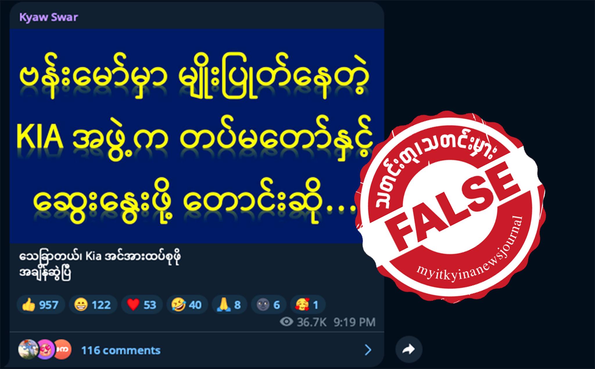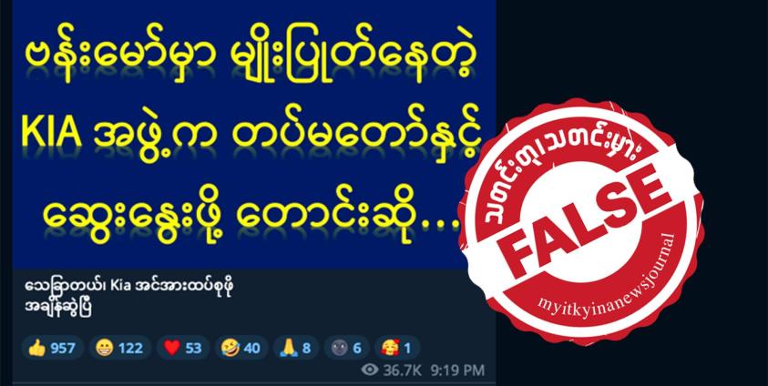 Kyaw Swar တယ်လီဂရန်ချန်နယ်လ်က ဖြန့်ဝေထားတဲ့ “ဗန်းမော်မှာ မျိုးပြုတ်နေတဲ့ KIA အဖွဲ့က တပ်မတော်နှင့် ဆွေးနွေးဖို့ တောင်းဆို၊ KIA အင်အားထပ်စုဖို့ အချိန်ဆွဲပြီ” ဆိုတာကတော့ ဝါဒဖြန့် သတင်းအမှား အကြောင်းအရာသာ ဖြစ်ပါတယ်။