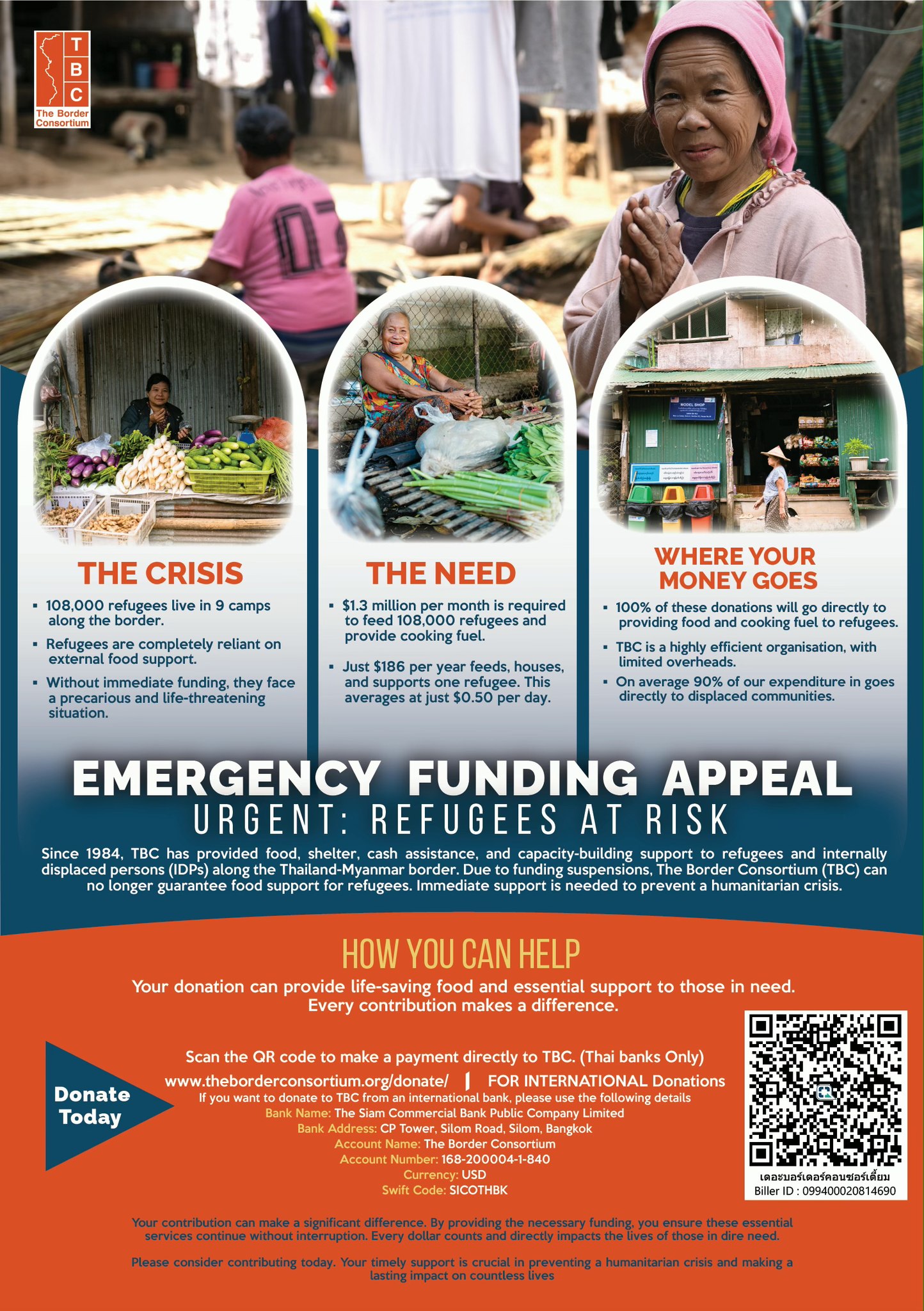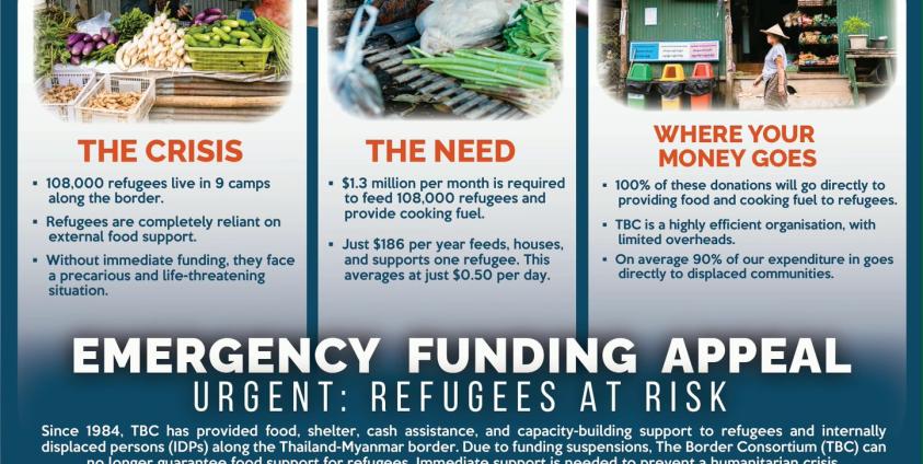 ထိုင်းမြန်မာနယ်စပ်ရှိ ဒုက္ခသည်စခန်း ၉ ခု တွင် TBC မှ ရိက္ခာထောက်ပံ့သည့် လူဦးရေ ၁၀၈,၀၀၀ (တစ်သိန်းရှစ်ထောင်) ဦးရှိပြီး တစ်လစာ ရိက္ခာအတွက် အမေရိကန်ဒေါ်လာ စုစုပေါင်း ၁ ဒသမ ၃ (၁.၃) သန်း ကုန်ကျမှုရှိသည်ဟု ရံပုံငွေ လိုအပ်ချက်နှင့်ပတ်သက်၍ အလှူရှင်များ လှူဒါန်းနိုင်ရန် ပြီးခဲ့သည့် ဖေဖော်ဝါရီလတွင် TBC က ထုတ်ပြန်ထားသည်။