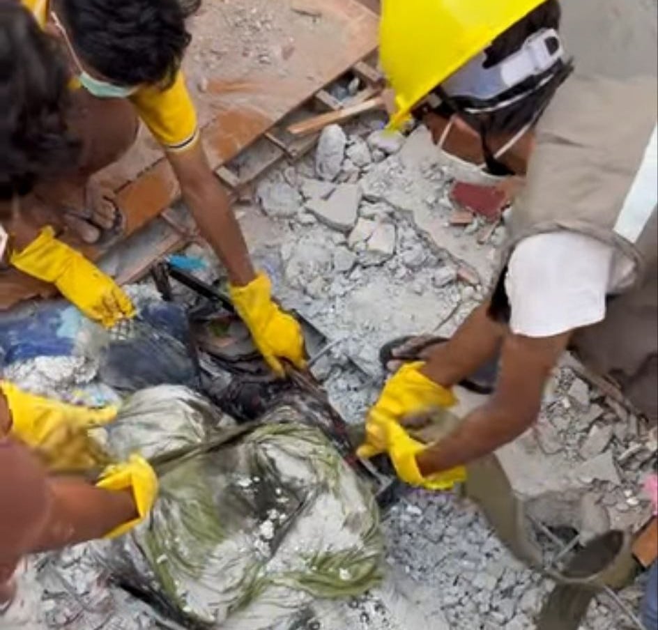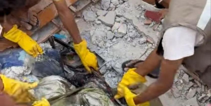 ပုံအညွှန်း - မန္တလေးမြို့ရှိအဆောက်အဦတခုမှ ရုပ်အလောင်းတလောင်းကို ကယ်ဆယ်သူများက ဆွဲထုတ်နေပုံ။