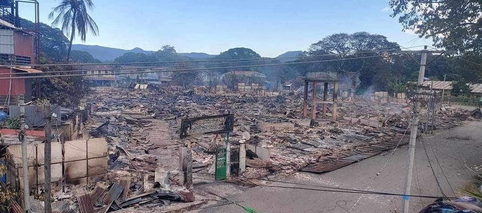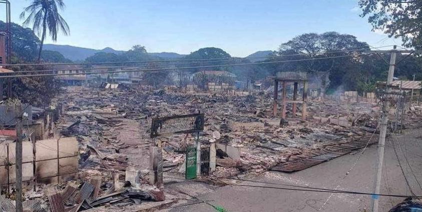 အင်းတော်မြို့သိမ်းတိုက်ပွဲအတွင်း မီးလောင်ပျက်စီးခဲ့သည့် မြို့မစျေး /Credit