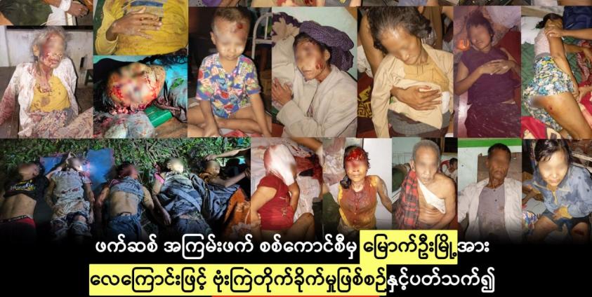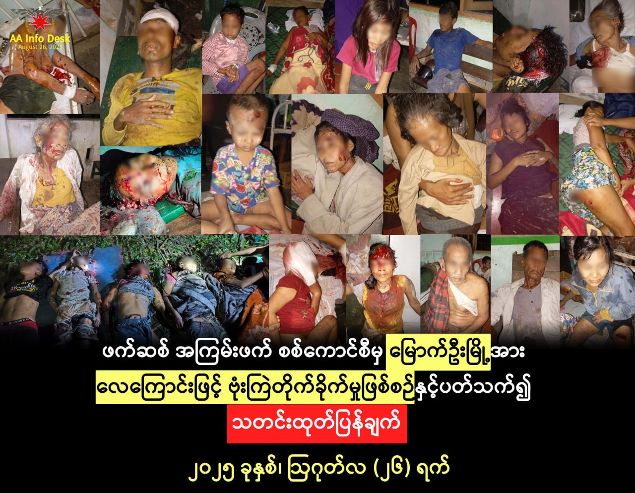 “၂၀၂၅ ခုနှစ်၊ ဩဂုတ်လ (၂၅) ရက်နေ့၊ ည (၁၁) နာရီ ( ၂၅) မိနစ်အချိန်ခန့်တွင် အာရက္ခပြည်၊ မြောက်ဦးမြို့၊ ဒိုင်းကျီရပ်ကွက်အား ဖက်ဆစ် အကြမ်းဖက်စစ်ကောင်စီသည် ဂျက်ဖိုက်တာဖြင့် ဗုံး (၂) လုံး ကြဲချတိုက်ခိုက်ခဲ့သည်။ ယင်းသို့ လေကြောင်း တိုက်ခိုက်မှုကြောင့် အလှူလုပ်ရန် ပြင်ဆင်နေကြသော မိသားစုဝင်များ နှင့် ၎င်းပတ်ဝန်းကျင်အနီးအနားမှ ကလေးငယ် (၅) ဦး အပါအဝင် အပြစ်မဲ့ အရပ်သားပြည်သူ (၁၂) ဦး သေဆုံးခဲ့ရပြီး (၂၀)ဦးလည်း ထိခိုက်ဒဏ်ရာများ ရရှိကာ လူနေအိမ် (၈) လုံး ပျက်စီးခဲ့ရသည်”ဟု ယနေ့ သြဂုတ်လ ၂၆ ရက်၊ နေ့လယ်ပိုင်း ထုတ်ပြန်ချက်တွင် ဖော်ပြထားသည်။
