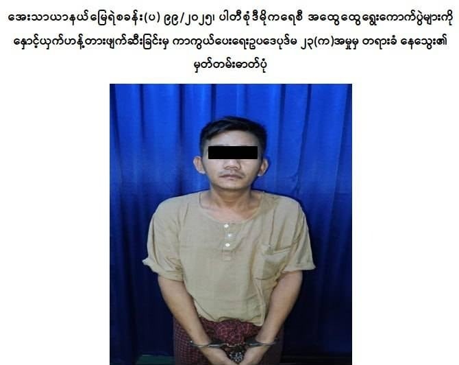 ရွေးကောက်ပွဲပျက်ပြားစေရန် ရည်ရွယ်ပြီး လူမှုကွန်ရက်စာမျက်နှာပေါ်တွင် လှုံ့ဆော်ခြင်း၊ ဝါဒဖြန့်ခြင်း များလုပ်ဆောင်ခဲ့မှုဖြင့် တောင်ကြီးမြို့နယ်တရားရုံးက အလုပ်နှင့်ထောင်ဒဏ် ခုနစ်နှစ် ချမှတ်ခဲ့ခြင်းဖြစ် ကြောင်း ဆိုထားသည်။