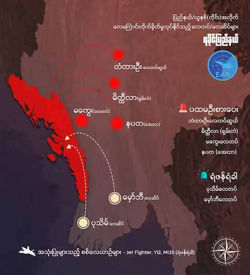 ရခိုင်ကို လာရောက်ဗုံးကြဲရာတွင် မန္တလေးတိုင်းရှိ တံတားဦးလေတပ်နှင့် မိတ္ထီလာ(ရှမ်းတဲ)လေတပ်၊ မကွေးတိုင်း၊ မကွေးမြို့ရှိ မကွေးလေတပ်၊ နေပြည်တော်ရှိ အေလာလေတပ်တို့ကို ပထမဦးစားပေးအနေဖြင့် အသုံးပြုပြီး တစ်ခါတရံတွင် ဧရာဝတီတိုင်းရှိ ပုသိမ်လေတပ်နှင့် ရန်ကုန်တိုင်းရှိ မှော်ဘီလေတပ်တို့ကို အသုံးပြုသည်ဟု EAR ၏ အောက်တိုဘာလ ၁၈ ရက်ထုတ်ပြန်ချက်တွင် ဖော်ပြထားသည်။