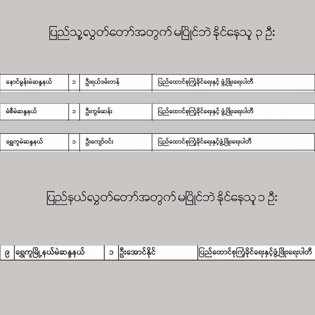 စစ်အုပ်စုရဲ့ ရွေးကောက်ပွဲဥပဒေတွေအရတော့ မဲဆန္ဒနယ် တစ်နယ်မှာ ဝင်ရွေးကောက်ခံမယ့် လွှတ်တော်ကိုယ်စားလှယ်လောင်း တစ်ယောက်ပဲရှိရင် အဲဒီနယ်မှာ ရွေးကောက်ပွဲ မကျင်းပတော့ဘဲ ဝင်ပြိုင်တဲ့ တစ်ယောက်ထဲသော ကိုယ်စားလှယ်လောင်းကို လွှတ်တော်ကိုယ်စားလှယ်အဖြစ် သတ်မှတ်ရမယ်လို့ ပြဌာန်းထားတာပါ။