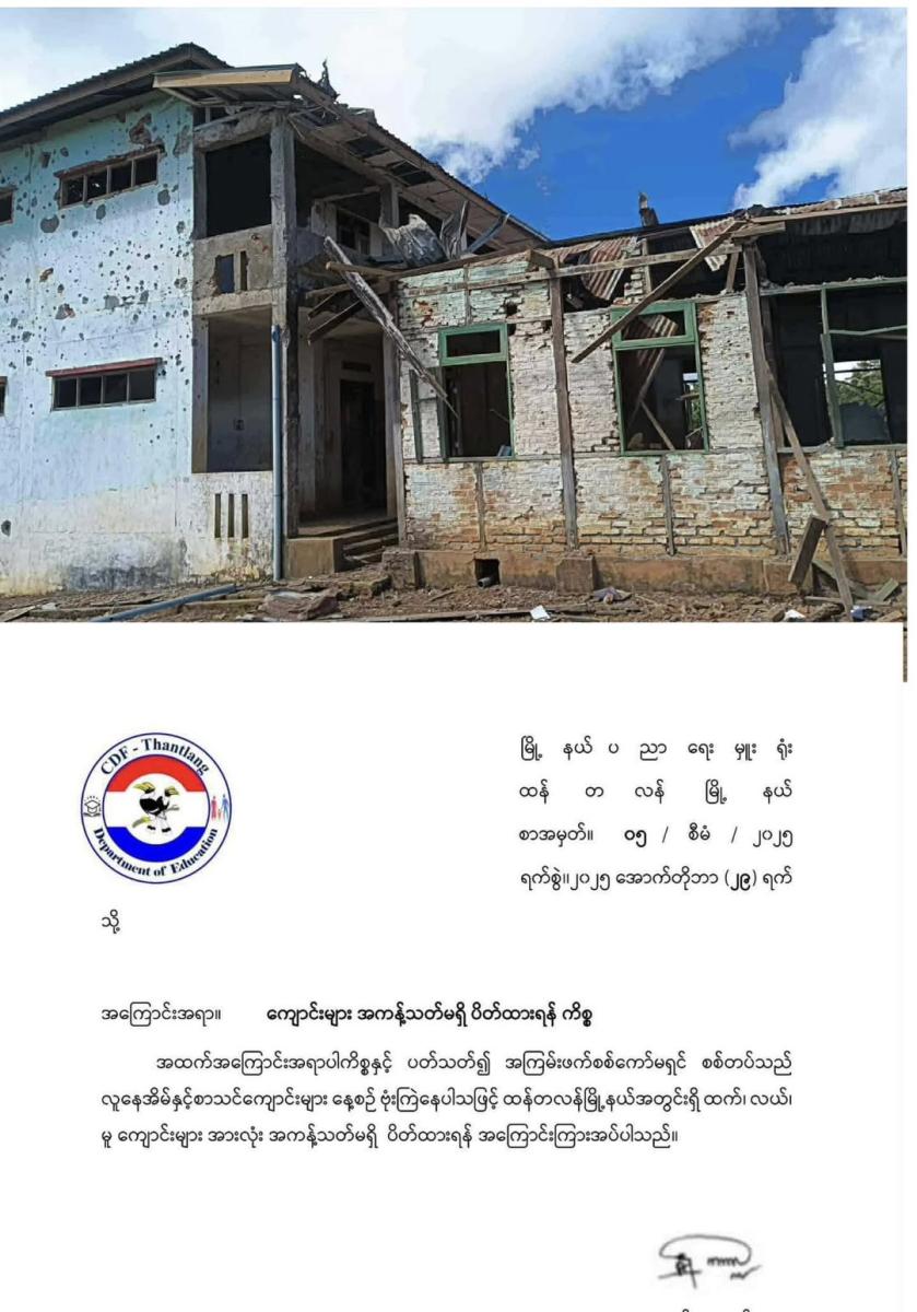 စစ်ကော်မရှင်တပ်ရဲ့ လေကြောင်းရန်ကြောင့် ချင်းပြည်နယ်၊ ထန်တလန် မြို့နယ်အတွင်းရှိ အထက်တန်းကျောင်း၊ အလယ်တန်းကျောင်း၊ မူလတန်းကျောင်းတွေ အားလုံး အကန့်အသတ်မရှိ ပိတ်ထားဖို့ CDF –Thantlang ရဲ့ ပညားရေးဌာနက အောက်တိုဘာလ ၂၉ ရက်နေ့မှာ ထုတ်ပြန်ထားပါတယ်။