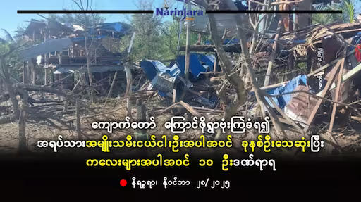 မြန်မာအကြမ်းဖက်လေတပ်က ကျောက်တော်မြို့နယ်ရှိ နေရာသုံးခုကို ယနေ့နံနက် ၁ဝ နာရီ ၄ဝ မိနစ်မှ ၁ဝ နာရီ ၄၅ မိနစ်ကြားတွင် တပြိုင်တည်း ဗုံးလာကြဲခဲ့သည်ဟု ဒေသခံများက ပြောသည်။