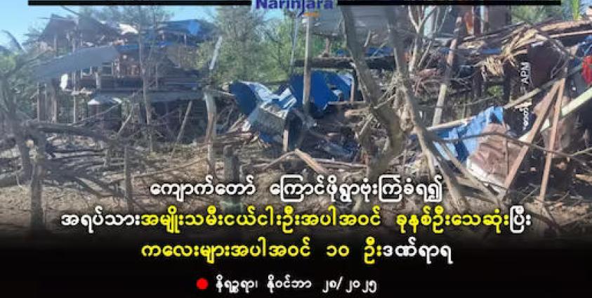 အာရက္ခတပ်တော်(AA)ထိန်းချုပ်ထားသည့် ရခိုင်ပြည်၊ ကျောက်တော်မြို့နယ်၊ ကြောင်ဖိုရွာ ယနေ့နံနက်က မြန်မာလေတပ်က ဂျက်တိုက်လေယာဉ်ဖြင့် ဗုံးကြဲတိုက်ခိုက်သည့်အတွက် အရပ်သား အမျိုးသမီးငယ် ငါးဦးအပါအဝင် ခုနစ်ဦးသေဆုံးပြီး ကလေးများအပါအဝင် ၁ဝ ဦးဒဏ်ရာရကာ နေအိမ် ၄ ဆောင် ပျက်စီးသွားခဲ့သည်ဟု သိရသည်။
