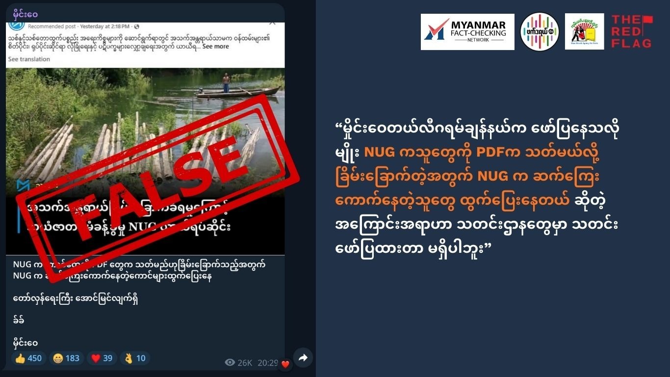 စစ်ကော်မရှင်ရဲ့ ဝါဒဖြန့်ချန်နယ်တခုဖြစ်တဲ့ မှိုင်းဝေတယ်လီဂရမ်ချန်နယ်ကနေ ဖြန့်ဝေနေတဲ့ အကြောင်းအရာဖြစ်တဲ့ “ NUG ကသူတွေကို PDFက သတ်မယ်လို့ ခြိမ်းခြောက်တဲ့အတွက် NUG က ဆက်ကြေးကောက်နေတဲ့သူတွေ ထွက်ပြေးနေတယ်”ဆိုတာ စကားလုံးတွေကို ပုံဖော်ပြီး လိုရာဆွဲရေးသားထားတဲ့ သတင်းအမှားဖြစ်ကြောင်း စိစစ်တွေ့ရှိခဲ့တယ်။