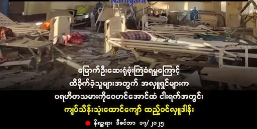 "သေဆုံး၊ ဒဏ်ရာရသွားတဲ့သူတွေအတွက် လက်ခံရရှိထားတဲ့ အလှူငွေတွေထဲက ကျပ်သိန်း ၂၅၀၀ လောက်ကိုကူညီပြီး အဲဒီမှာပြန်သုံးသွားမယ်။ ပျက်စီးသွားတဲ့ စက်ပစ္စည်းတွေ၊ ဆေးဝါးတွေတချို့ကို ပြန်ဝယ်ထည့်ဖို့ အာရက္ခပြည်သူ့တော်လှန်ရေးအစိုးရ၊ ဗဟိုကျန်းမာရေးဌာနနဲ့ ဆွေးနွေးနေတယ်။ ကျန်တဲ့အလှူငွေကိုတော့ စစ်ဘေးရှောင်တွေကို ကူညီသွားမယ်"ဟု နိရဉ္စရာကို ပြောသည်။