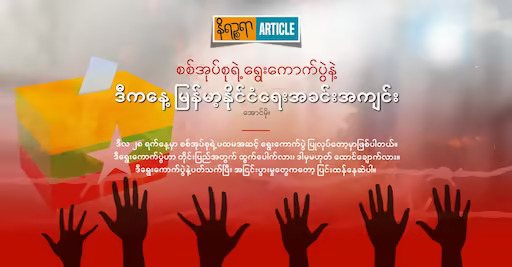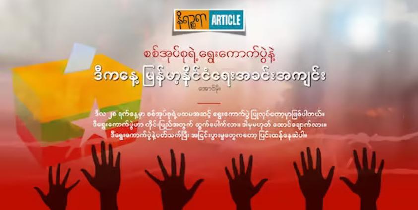 ဒီကနေ့ စစ်အုပ်စုရဲ့ ရွေးကောက်ပွဲကို ပြည်တွင်း ပြည်ပ မြန်မာလူ့အဖွဲ့အစည်းတွေနဲ့ နိုင်ငံတကာ ဆန့်ကျင်နေကြတာကလည်း စစ်အုပ်စုလုပ်တဲ့ ရွေးကောက်ပွဲမို့လို့ တမင်ဖျက်လိုဖျက်ဆီး လုပ်နေကြတာ၊ ဆန့်ကျင်နေကြတာမဟုတ်ပါဘူး။ ဒီရွေးကောက်ပွဲက တိုင်းပြည်အတွက် ဘာမှ ကောင်းမွန်တဲ့ အဖြေ ထွက်လာနိုင်မှာ မဟုတ်သလို ပိုပြီး ဆိုးရွားတဲ့အခြေအနေကို ရောက်ရှိသွားနိုင်တဲ့အတွက် ကန့်ကွက် ဆန့်ကျင်နေကြတာ ဖြစ်ပါတယ်။ ဒီရွေးကောက်ပွဲမှာ မြန်မာပြည်သူတွေ လိုလားနေတဲ့ ဒီမိုကရေစီကို မပြောနဲ့ တိုင်းရင်းသားတွေ လိုလားတောင့်တနေတဲ့ ဖက်ဒရယ် ဒီမိုကရေစီလည်း ဖြစ်လာနိုင်စရာမရှိပါ။ အဓိက အာဏာသိမ်းထားတဲ့ စစ်တပ် ထွက်ပေါက်ရဖို့ ပြုလုပ်တဲ့ ရွေးကောက်ပွဲသာ ဖြစ်ပါတယ်။ ဒါကြောင့် ဒီကနေ့ စစ်အုပ်စုက ကျင်းပဖို့ စီစဉ်နေတဲ့ ရွေးကောက်ပွဲဟာ တိုင်းပြည်အတွက် ထွက်ပေါက်မဟုတ်သလို ထောင်ချောက်ဆိုတာမျိုး ပြောဆိုနေကြတာ ဖြစ်ပါတယ်။