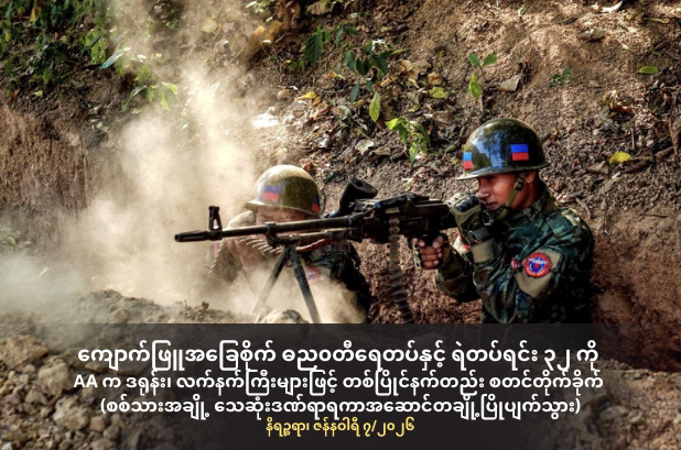 “ မြို့ပြင်မှာတော့ ထိတွေ့တိုက်ပွဲတွေဟာအဆုတ်အတက်ကြမ်းနေဆဲသာဖြစ်ပါတယ်။လက်ရှိအနေ အထားအရ အာရက္ခတပ်ဘက်ကမြို့တွင်းကို ဝင်ရောက်လာမှာ စိုးတဲ့အတွက် စကစစစ်ကြောင်းတော်တော်များများဟာ မြို့ရဲ့ အနီးတစ်ဝိုက်အထိ ဆုတ်ခွာထားရတာကိုတွေ့ရပါတယ်။ တရုတ်စက်လတ်အသံတွေလို့ ယူဆရတဲ့အတွက် အာရက္ခတပ်တော်ဟာပစ်အားသုံးပြီး စစ်ရေးအသာစီး ရနေနိုင်တယ်လို့ သုံး သပ်ရပါတယ်” ဟုလည်း ရေးသားထားသည်။