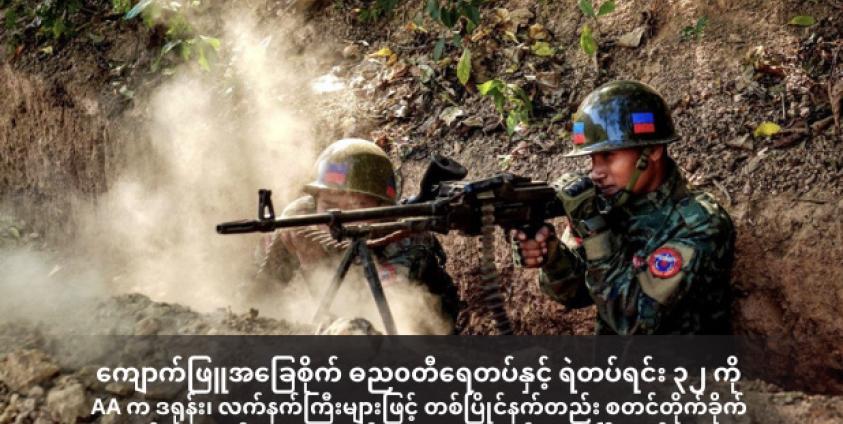 သဉ္ဇာနွယ် - အာရက္ခတပ်တော်(AA)သည် ရခိုင်ပြည်မှ အကြီးဆုံးရေတပ်စခန်းဖြစ်သည့် ကျောက်ဖြူမြို့အခြေစိုက်ဓည၀တီရေတပ်စခန်းနှင့် ကျောက်ဖြူမြို့၏ အဓိက ခံကတုတ်စစ်စခန်းကြီးတစ်ခုဖြစ်သည့် ရဲတပ်ရင်း (၃၂) ကို ဒရုန်းများအပါအဝင် လက်နက်ကြီးများဖြင့် ယခုရက်ပိုင်းကစပြီး တစ်ပြိုင်နက်တည်း တိုက်ခိုက်နေပြီဟု သတင်းရရှိသည်။