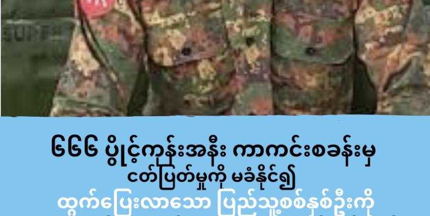 သဉ္ဇာနွယ် — ရခိုင်-ပဲခူး ရိုးလမ်းပေါ်ရှိ ၆၆၆ ပွိုင့်ကုန်းအနီး ကာကင်းစခန်းမှငတ်ပြတ်မှုကို မခံနိုင်၍ လက်နက်ခဲယမ်းအပြည့်အစုံဖြင့်ထွက်ပြေးလာသည့် ပြည်သူ့စစ်နှစ်ဦးကို အာရက္ခတပ်တော် (AA) မှ ယမန်နေ့ကဖမ်းဆီးရမိကြောင်း သတင်းရရှိသည်။