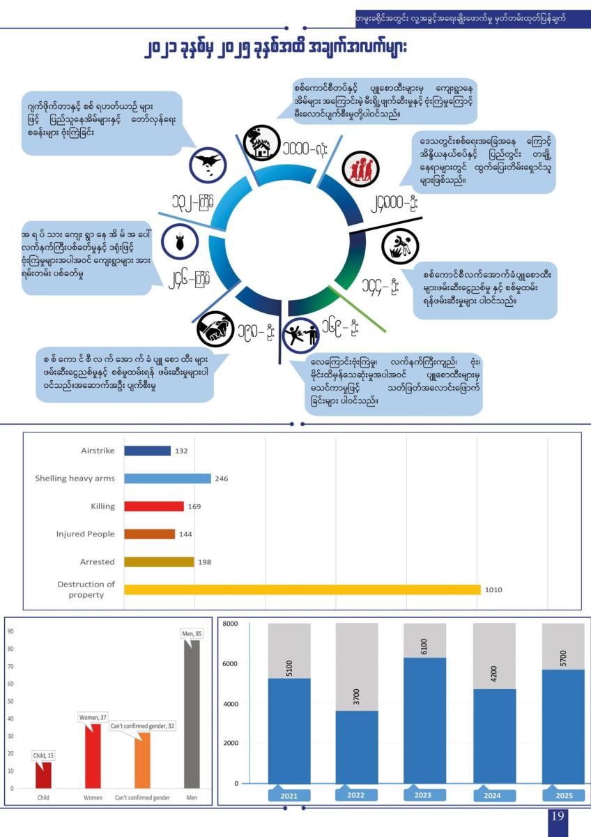 ၂၀၂၁ ခုနှစ်မှ ၂၀၂၅ ခုနှစ် နှစ်ကုန်အထိ စစ်ရေးပဋိပက္ခကြောင့် ဒေသအတွင်း လူဦးရေ (၂၄,၈၀၀) ခန့် အိုးအိမ်စွန့်ခွာ စစ်ဘေးရှောင်ကြရပြီး စစ်ကော်မရှင်တပ်၏ လေကြောင်းတိုက်ခိုက်ခြင်း၊ လက်နက်ကြီးပစ်ခတ်ခြင်း၊ သတ်ဖြတ် ခြင်းနှင့် ၎င်းတို့လက်အောက်ခံ ပျူစောထီးအဖွဲ့များ၏ မတရားဖမ်းဆီး ရိုက်နှက် သတ်ဖြတ်မှုများအပြင် မြေမြှုပ်မိုင်း များကြောင့် အမျိုးသမီးနှင့် ကလေးများအပါအဝင် အပြစ်မဲ့ပြည်သူ (၁၆၉) ဦး သေဆုံးခဲ့ရသည်ဟု အစီရင်ခံစာမှာ ဖော်ပြထားသည်။