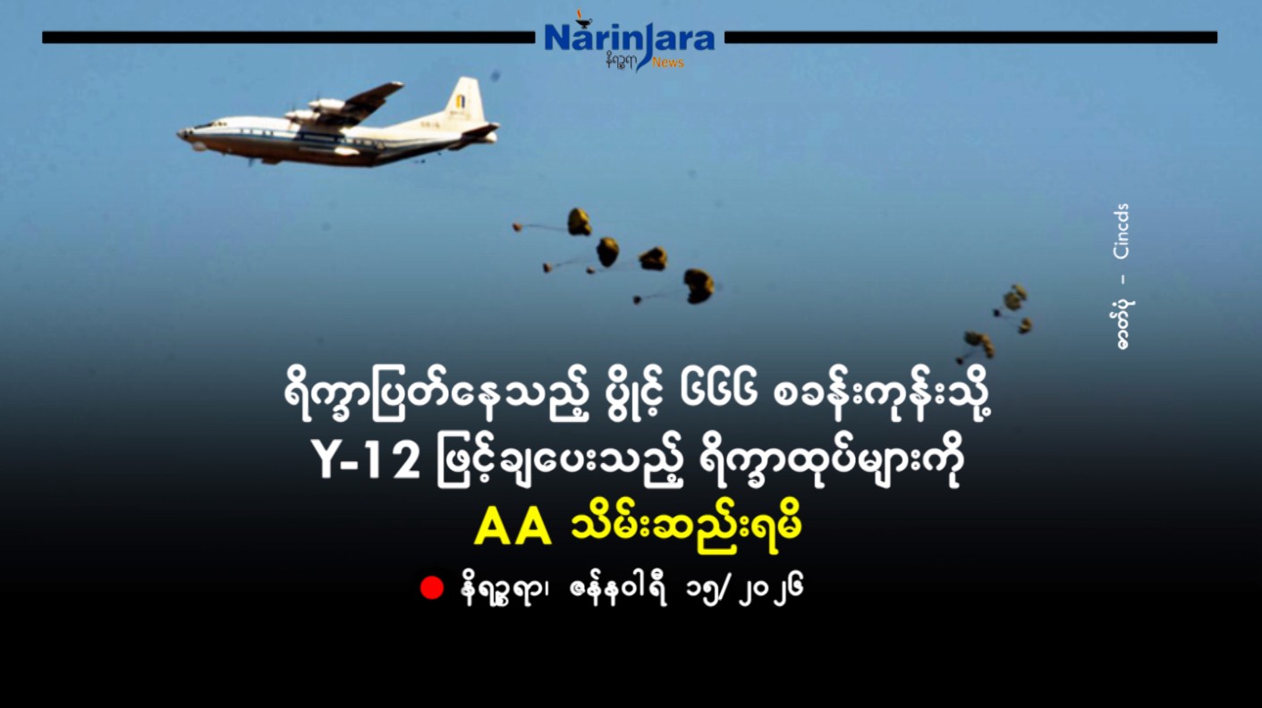 "Y-12 နဲ့ချတာ အထုပ်က။ သူတို့ဆီမရောက်ဘူး။ AA နှင့် တော်လှန် ရေးတပ်ဖွဲ့ဝင်တွေဆီရောက်သွားတာ။ အထဲမှာတော့ ဒံပေါက်ချက်ပြီးသားဗူးတွေပါတယ်။ ရေတွေလည်း ပါတယ်" ဟု ပြောသည်။