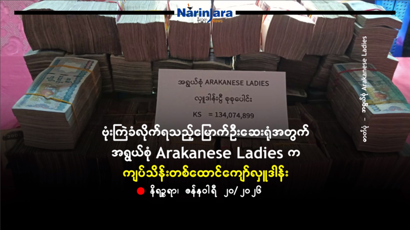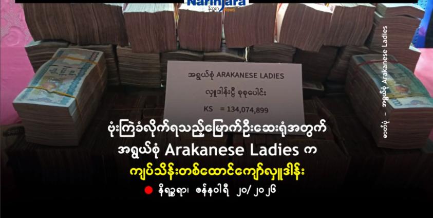 မောင်စာဂ — ဗုံးကြဲခံလိုက်ရသည့် ရခိုင်ပြည်၊ မြောက်ဦးမြို့ရှိ ပြည်သူ့ဆေးရုံကြီးအတွက် အရွယ်စုံ Arakanese Ladies က ကျပ်သိန်း တစ်ထောင်ကျော်ကို လှူဒါန်းလိုက်သည်ဟု သိရသည်။