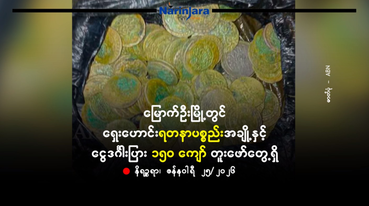 ဓာတ်ပုံ - ၂ဝ၂၆ ခုနှစ်၊ ဇန်နဝါရီလ ၂၄ ရက်နေ့တွင် မြောက်ဦးမြို့၌ တွေ့ရှိခဲ့သည့် ရှေးဟောင်း ရတနာပစ္စည်းအချို့နှင့် ငွေဒင်္ဂါးပြားများအားတွေ့ရစဉ်။ (Photo – ABN)