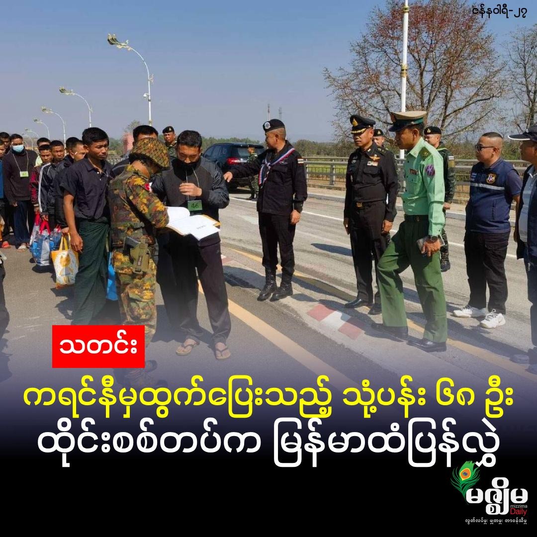 ဂျူချန်း — ကရင်နီပြည် မယ်စဲ့အကျဉ်းထောင်မှ ထိုင်းနိုင်ငံဘက်သို့ ထွက်ပြေးလွတ်မြောက်သွားသည့် သုံ့ပန်း ၆၈ ဦးကို ထိုင်းစစ်တပ်က မြန်မာစစ်ကော်မရှင်တပ်ဖွဲ့ထံသို့ ယမန်နေ့ (ဇန်နဝါရီလ ၂၆ ရက်)တွင် လွှဲပြောင်းပေးခဲ့ကြောင်း သတင်းရင်းမြစ်ထံက သိရသည်။