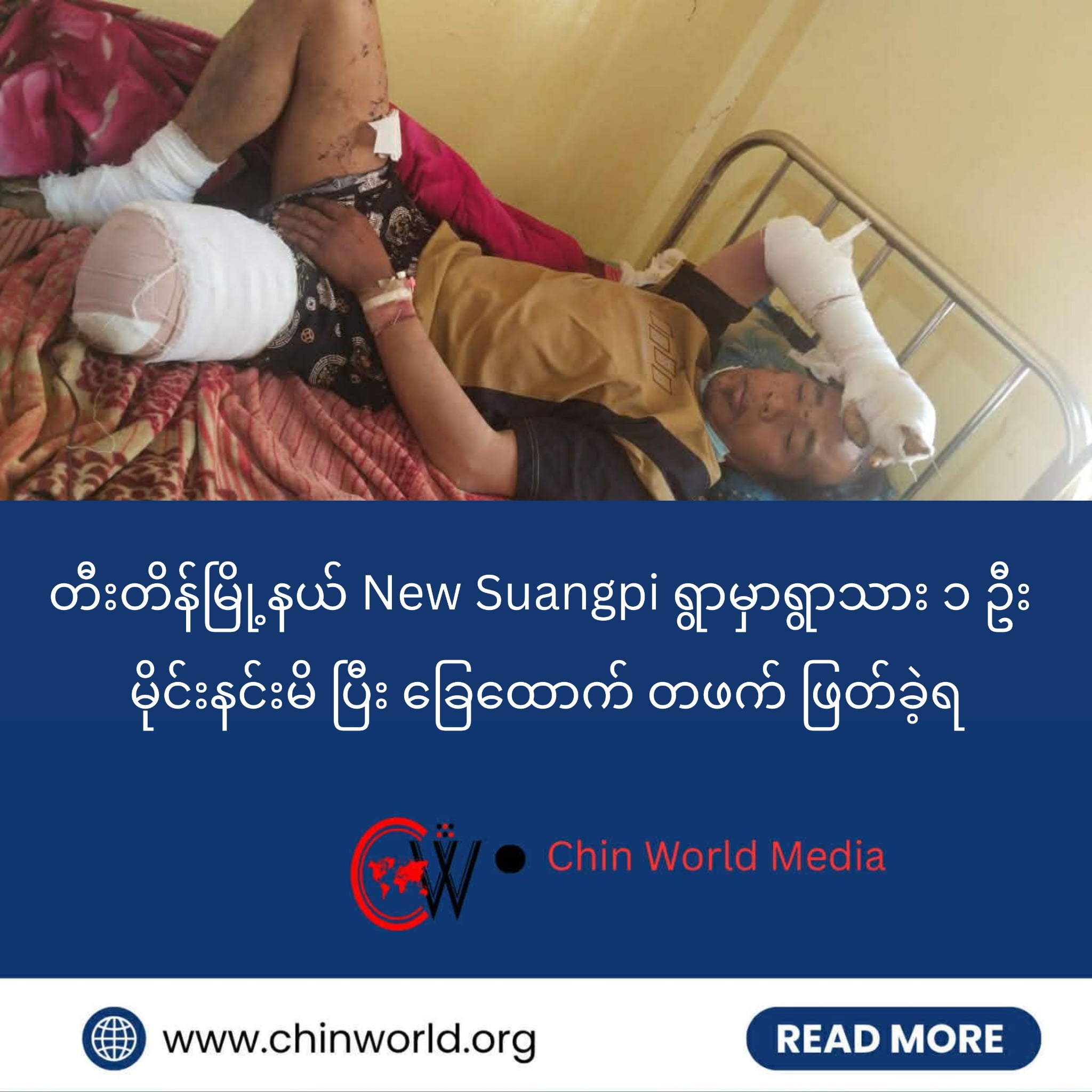 ဇန်နဝါရီလ ၂၅ ရက်နေ့က တီးတိန်မြို့နယ် New Suangpi ရွာမှာ စစ်ရှောင်ရာကနေ နေအိမ်ကို စောင့်ကြည့်ဖို့ ပြန်လာတဲ့ ရွာသား အသက် ၃၈ နှစ်အရွယ် Pa Khuang Tin Mang ဟာ ရွာအဝင်ဝကနေ မိုင်းနင်းမိခဲ့တာကြောင့် ခြေထောက်တဖက် ဖြတ်တောက်ခဲ့ရတယ်လို့ တီးတိန်ဒေသခံများထံမှ သိရှိရပါတယ်။