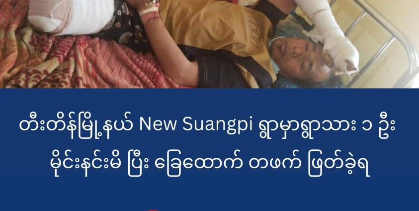 “စစ်ကောင်စီ စစ်သားတွေ စစ်ကြောင်းထိုး ချီတက်လာတာကြောင့် New Suangpi တရွာလုံး နီးစပ်ရာ ရွာတွေ၊ တောင်ယာတဲ တွေမှာ စစ်ရှောင် ထွက်ပြေးခဲ့ရတယ်။ ရွာထဲကနေ စစ်သားတွေ ထွက်ခွာသွားတဲ့သတင်းကြားတာနဲ့ အိမ်ကို သွားကြည့်ဖို့ ရွာထဲပြန်လာတော့ ရွာအဝင်ဝ ကနေ မိုင်းနင်းမိခဲ့တာ ဖြစ်တာဖြစ်တယ်။ လက်ရှိမှာတော့ လုံခြုံတဲ့ဆေးခန်းတခုမှာ ဆေးကုနေပါတယ်။ ဘယ်ဘက် ခြေထောက်ကိုတော့ ဒူနားကနေ ဖြတ်တောက်ခဲ့ရတယ်။ အသက်အန္တရာယ်တော့ မရှိတော့ဘူး” လို့ ဒေသခံ ရွာသား ၁ ဦးက ပြောပြပါတယ်။