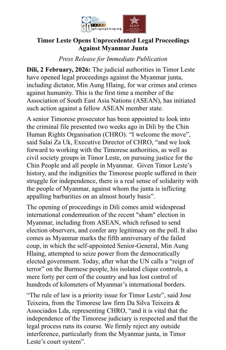 အရှေ့တီမော (Timor Leste) တရားရုံးရဲ့ အမှုလက်ခံတာနဲ့ပတ်သက်ပြီး မြန်မာစစ်ကော်မရှင်ကို တရားဥပဒေကြောင်းအရ အရေးယူနိုင်ဖို့အတွက် လုပ်ဆောင်နေတဲ့ အမှုတွေကို ပံ့ပိုးကူညီပေးနေတဲ့ အဖွဲ့အစည်း (MAP) နဲ့ CHRO က ဖေဖော်၀ါရီ ၂ ရက်နေ့မှာ ပူးတွဲထုတ်ပြန်ထားတာဖြစ်ပြီး အခုလို Timor Leste တရားရုံးက လက်ခံလိုက်တဲ့ယခု အမှုဟာ အာဆီယံအဖွဲ့ဝင်နိုင်ငံ အချင်းချင်းကြားမှာ ပထမဆုံးအကြိမ် တရားစွဲဆိုတဲ့အမှုဖြစ်ပါတယ်။