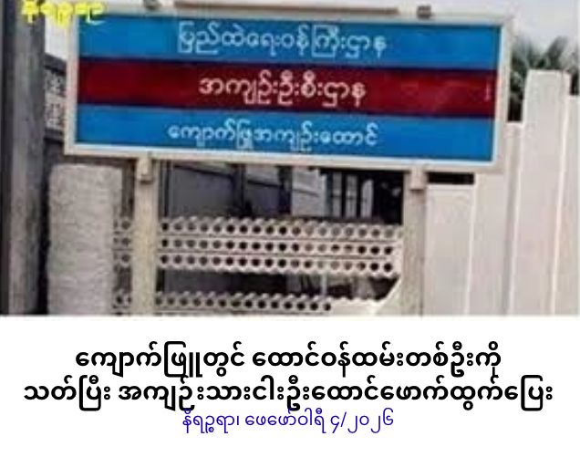 သဉ္ဇာနွယ် — ရခိုင်ပြည်၊ ကျောက်ဖြူတွင် ထောင်ဝန်ထမ်းတစ်ဦးကို သတ်ပြီး အကျဉ်းသားငါးဦး ထောင်ဖောက်ထွက်ပြေးသွားကြောင်း သတင်းရရှိသည်။
