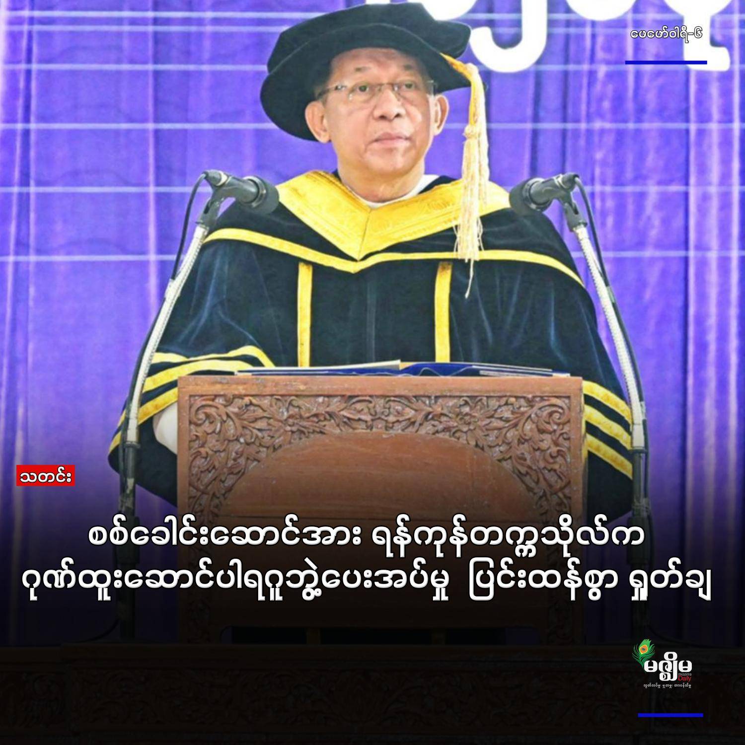 ဓါတ်ပုံ- အာဏာသိမ်း စစ်ခေါင်းဆောင် ဗိုလ်ချုပ်မှူးကြီး မင်းအောင်လှိုင်အား ဂုဏ်ထူးဆောင် ပါရဂူဘွဲ့ပေးအပ်မှုနှင့် ပတ်သက်ပြီး ပြင်းထန်စွာ ရှုတ်ချကြောင်း ရန်ကုန်တက္ကသိုလ် ကြားကာလတက္ကသိုလ်ကောင်စီ၊ ရန်ကုန်တက္က သိုလ်ဆရာ၊ ဆရာမများအသင်းနှင့် ရန်ကုန်တက္ကသိုလ်ကျောင်းသားများသမဂ္ဂ (ဗကသများအဖွဲ့ချုပ်) တို့က ယမန်နေ့ (ဖေဖော်ဝါရီ ၅)က ပူးတွဲသဘောထားထုတ်ပြန်သည်။