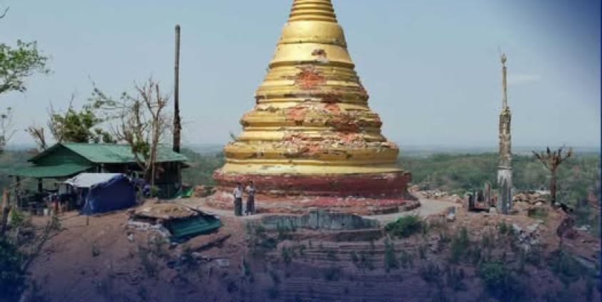 ပုံစာ - စစ်ကောင်စီ လေကြောင်းတိုက်ခိုက်မှုကြောင့် ပျက်စီးခဲ့သည့် မြောက်ဦးမြို့ရှိ ရွှေတောင်စေတီအား ၂၀၂၄ ခုနှစ်အတွင်းက တွေ့ရစဉ်။