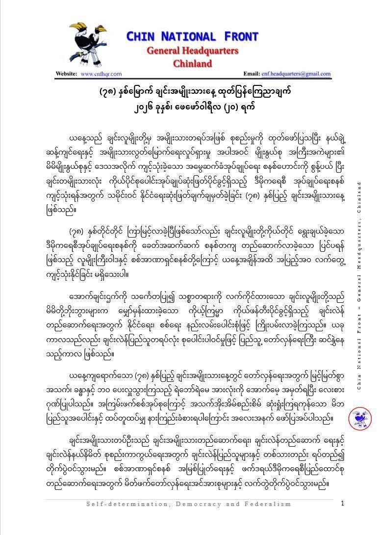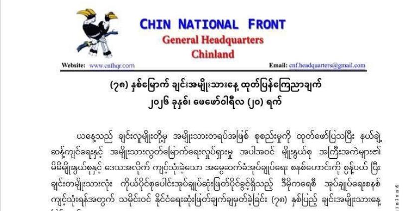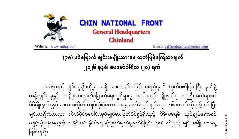 လူမျိုးကြီးဝါဒနဲ့ စစ်အာဏာရှင်စနစ်တို့ကြောင့် (၇၈) နှစ်တိုင်တိုင် ချင်းလူမျိုးတို့ကိုယ်တိုင် ရွေးချယ်ခဲ့တဲ့ ဒီမိုကရေစီအုပ်ချုပ်ရေးစနစ်ကို ယနေ့အချိန်ထိ အပြည့်အဝ လက်တွေ့မကျင့်သုံးနိုင်သေးဘူးလို့ ယနေ့ ဖေဖော်ဝါရီလ ၂၀ ရက်နေ့မှာ ကျရောက်သည့် ၇၈ နှစ်မြောက် ချင်းအမျိုးသားနေ့မှာ ချင်းအမျိုးသားတပ်ဦး ( CNF) က ထုတ်ပြန်ပါတယ်။