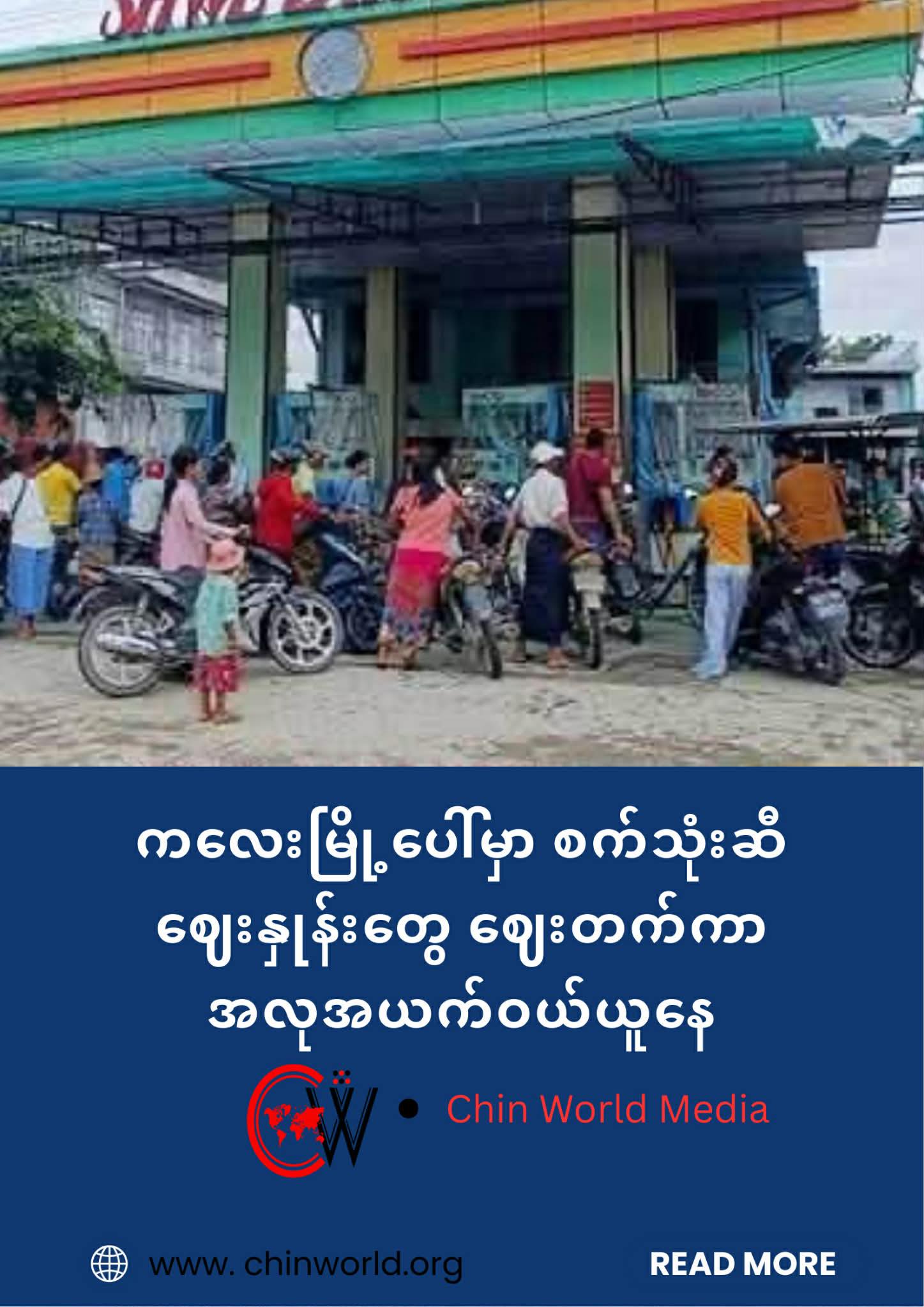 ကလေးမြို့ အရင် (BOC) မြမြတ်တ္တာမွန်ဆိုင် မှာ ဒေသခံ အမြောက်အများ လောင်စာဆီ ဓာတ်ဆီရရှိဖို့ တန်းစီကာ အလုယက်ဝယ်ယူနေကြပြီး စက်သုံးဆီ တဂါလံကို ၂၉၀၀၀ အထိ ဈေးပေါက်နေတယ်လို့လည်း ဒေသခံတွေဆီကနေ သိရပါတယ်။
